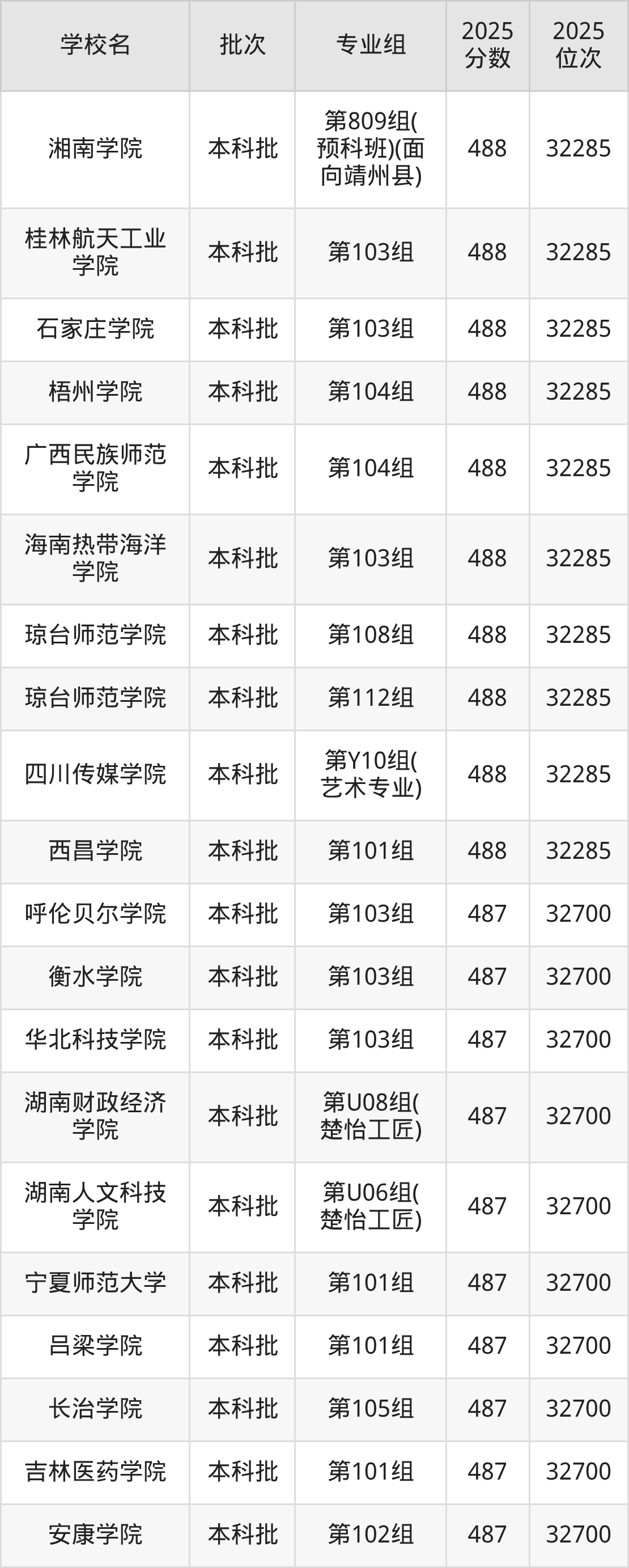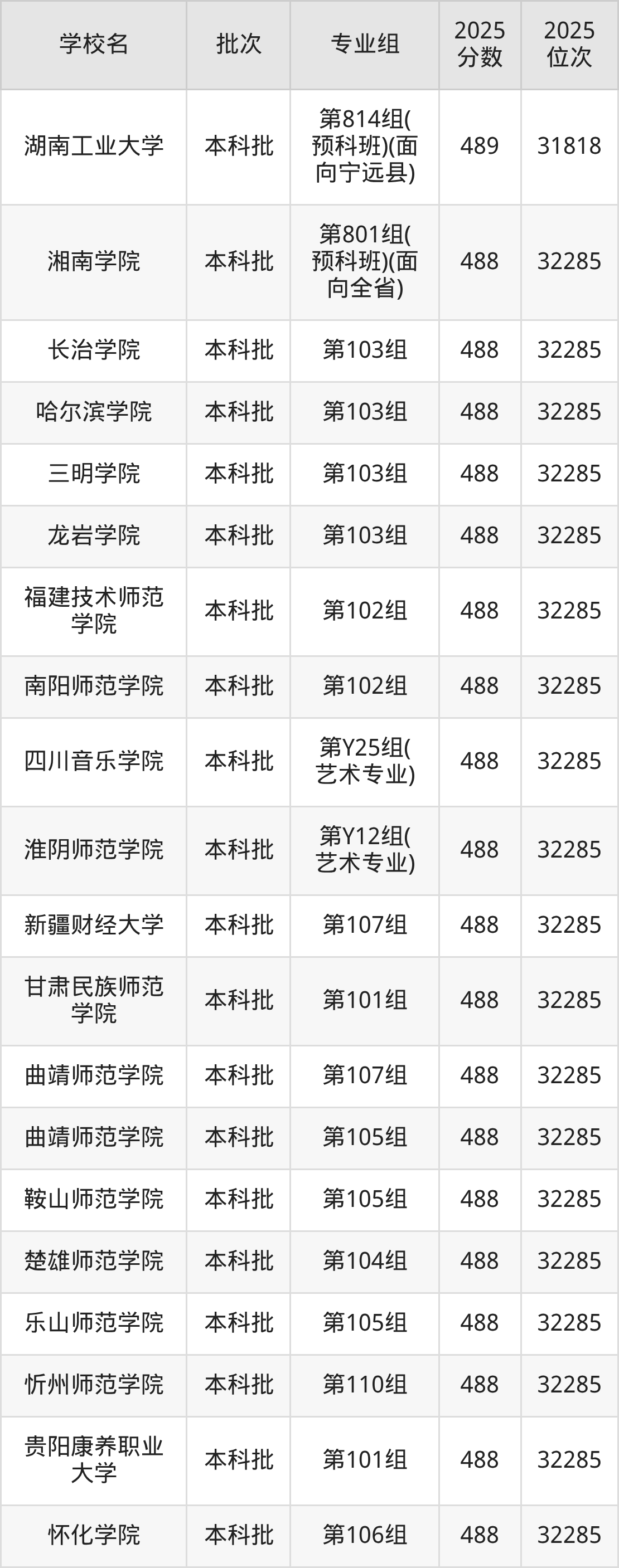 2025年湖南高考历史类488分(31819名~32285名)能上的大学有石家庄学院第103组、忻州师范学院第110组、长治学院第103组、鞍山师范学院第105组等。