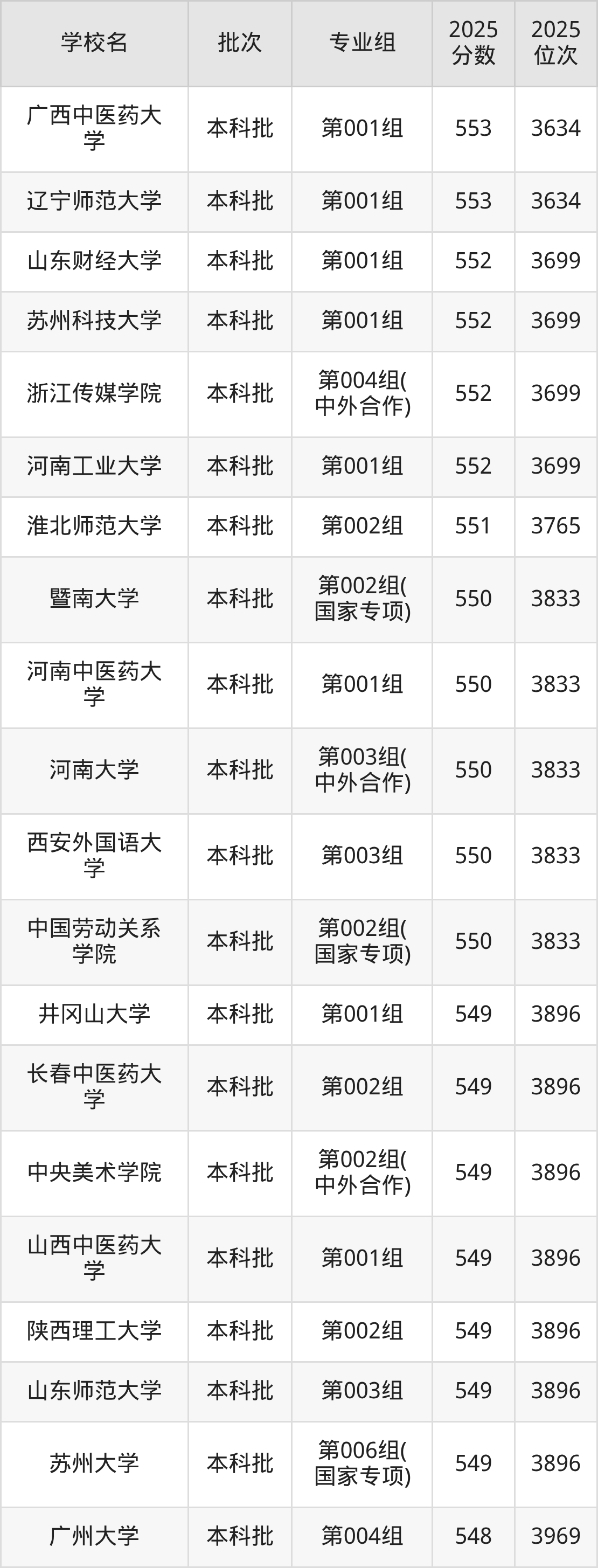 2025年吉林高考历史类553分(3574名~3634名)能上的大学有华北理工大学第001组、辽宁师范大学第001组、广西中医药大学第001组。