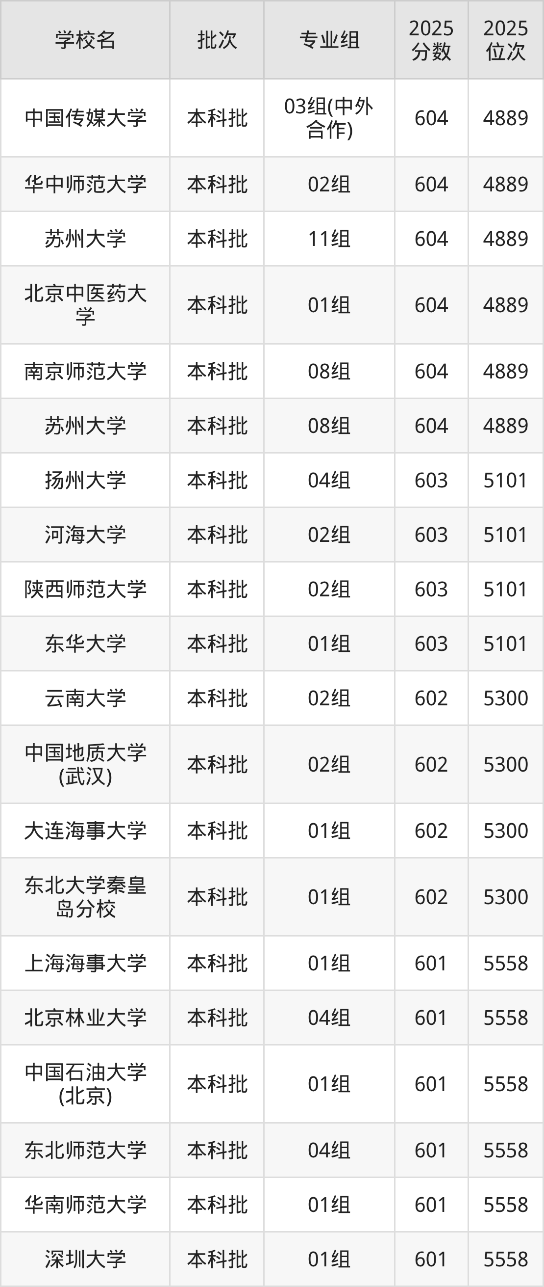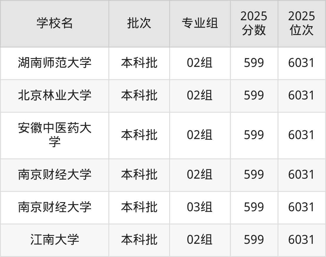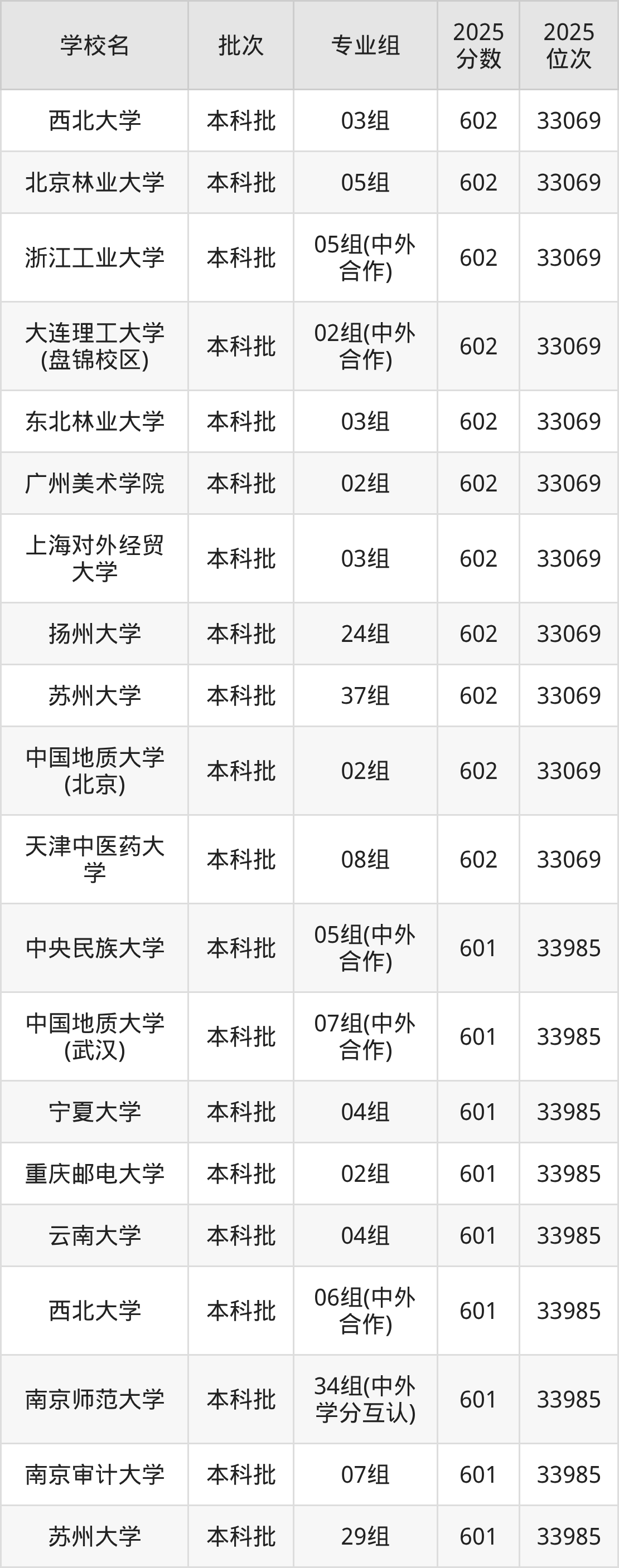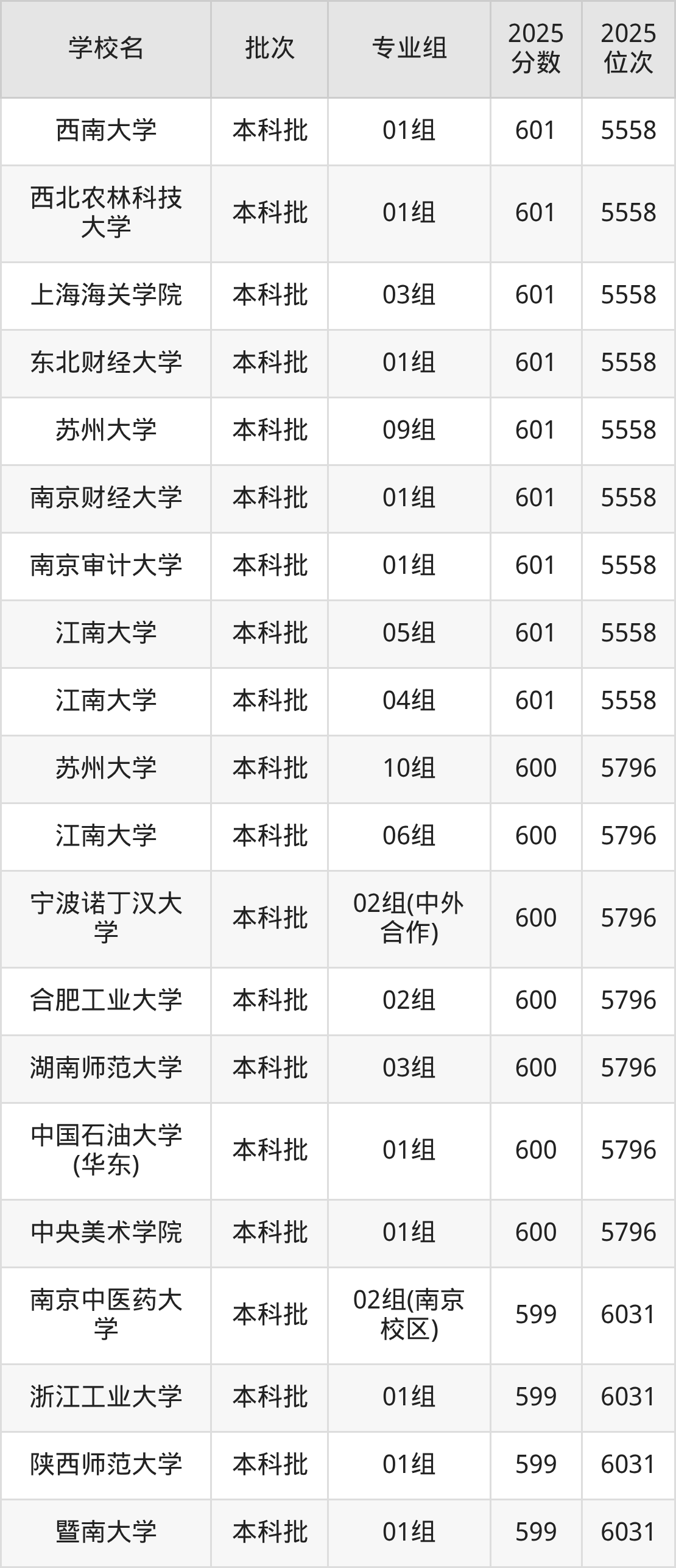 2025年江苏高考历史类601分(5301名~5558名)能上的大学有南京财经大学01组、南京审计大学01组、江南大学04组、江南大学05组等。