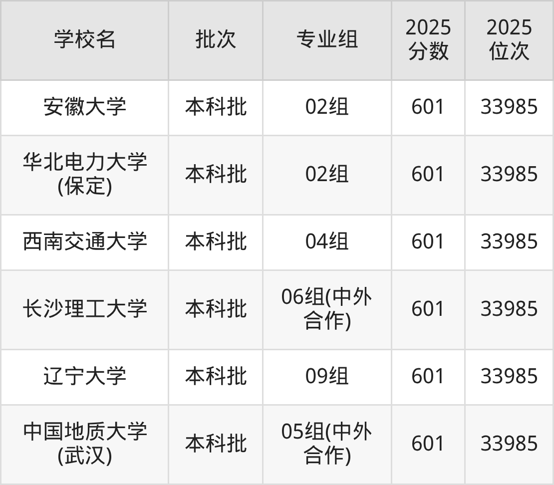 2025年江苏高考物理类601分(33070名~33985名)能上的大学有南京师范大学34组(中外学分互认)、南京审计大学07组、苏州大学29组、安徽大学02组等。