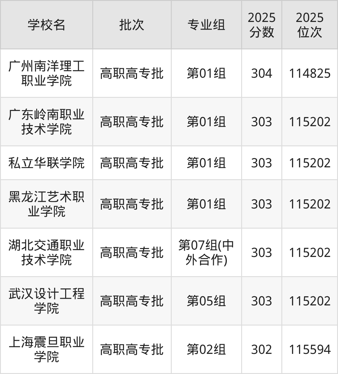 2025年湖北高考历史类303分(114826名~115202名)能上的大学有武汉设计工程学院第05组、湖北交通职业技术学院第07组(中外合作)、黑龙江艺术职业学院第01组、私立华联学院第01组等。