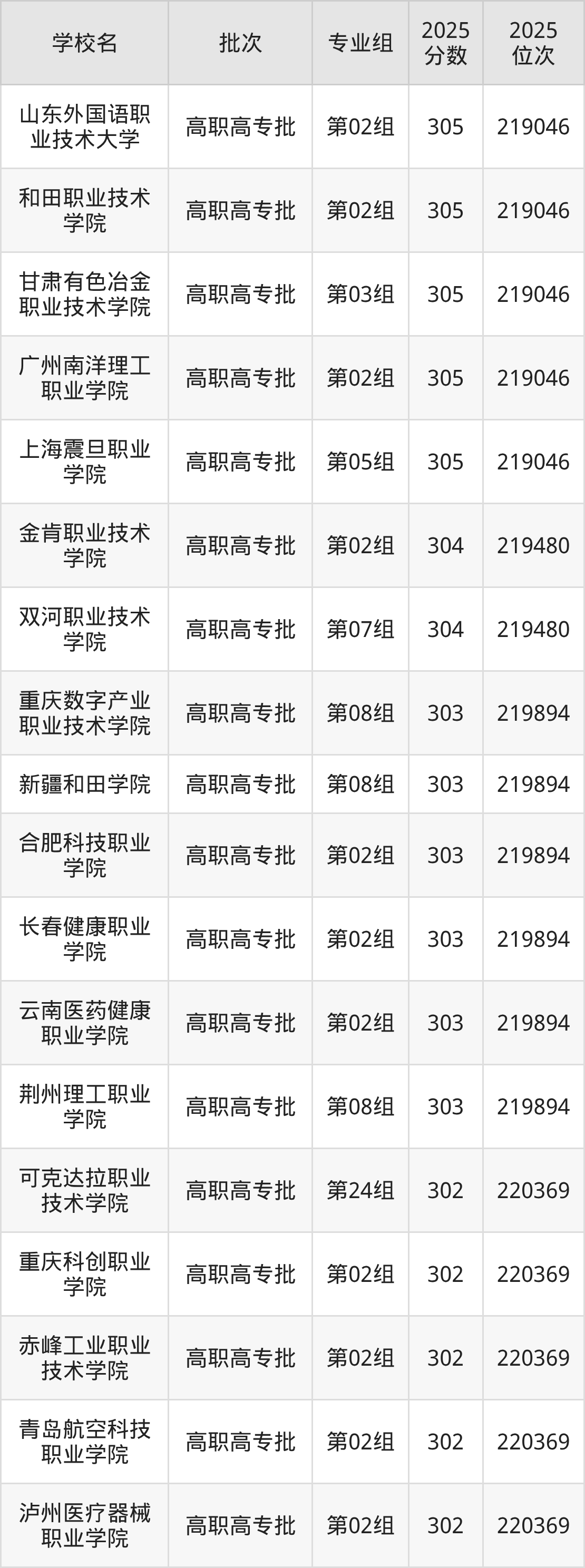 2025年湖北高考物理类303分(219481名~219894名)能上的大学有荆州理工职业学院第08组、长春健康职业学院第02组、合肥科技职业学院第02组、重庆数字产业职业技术学院第08组等。