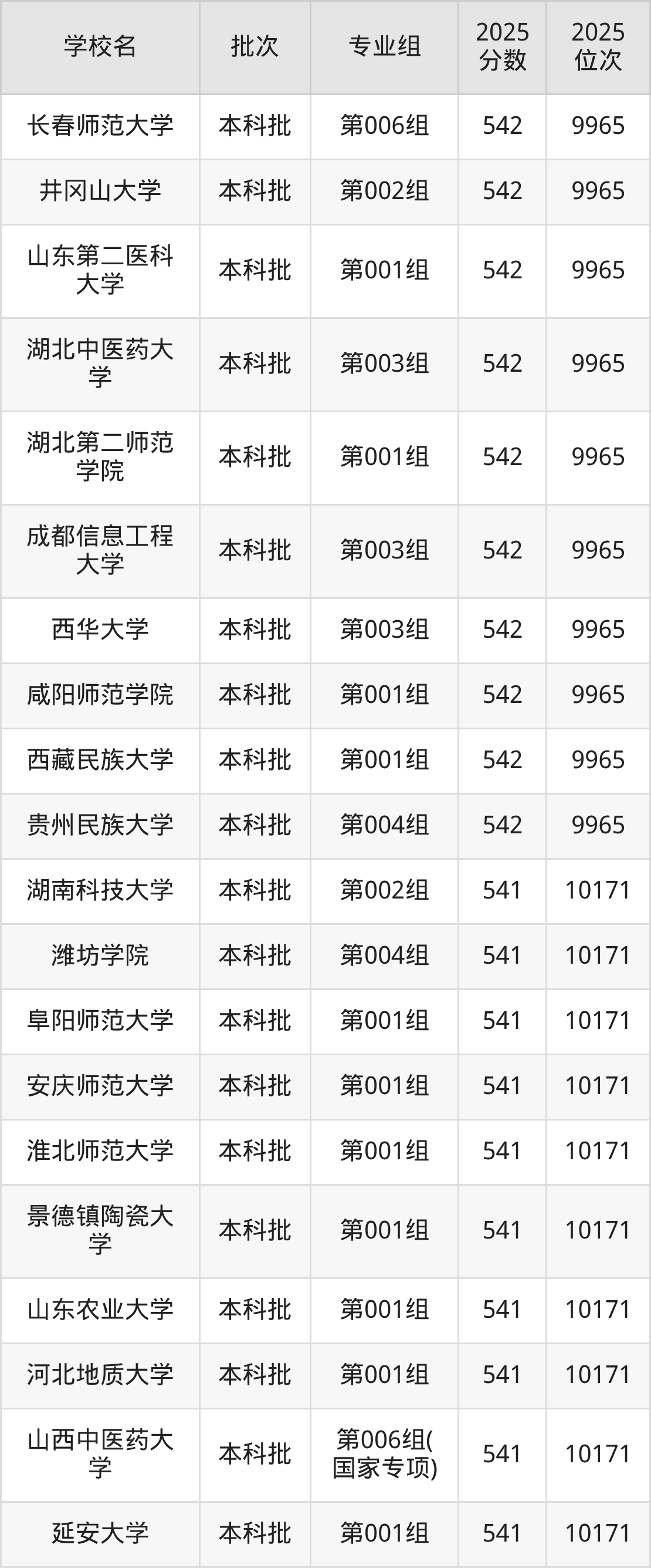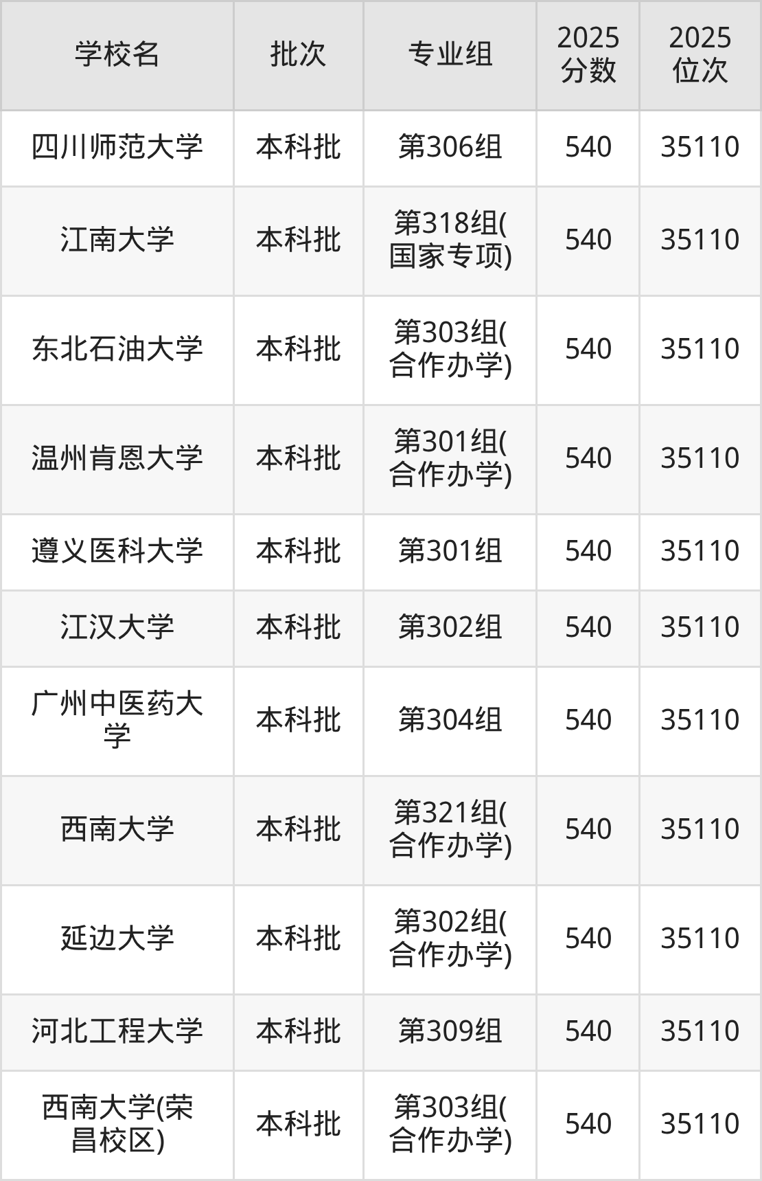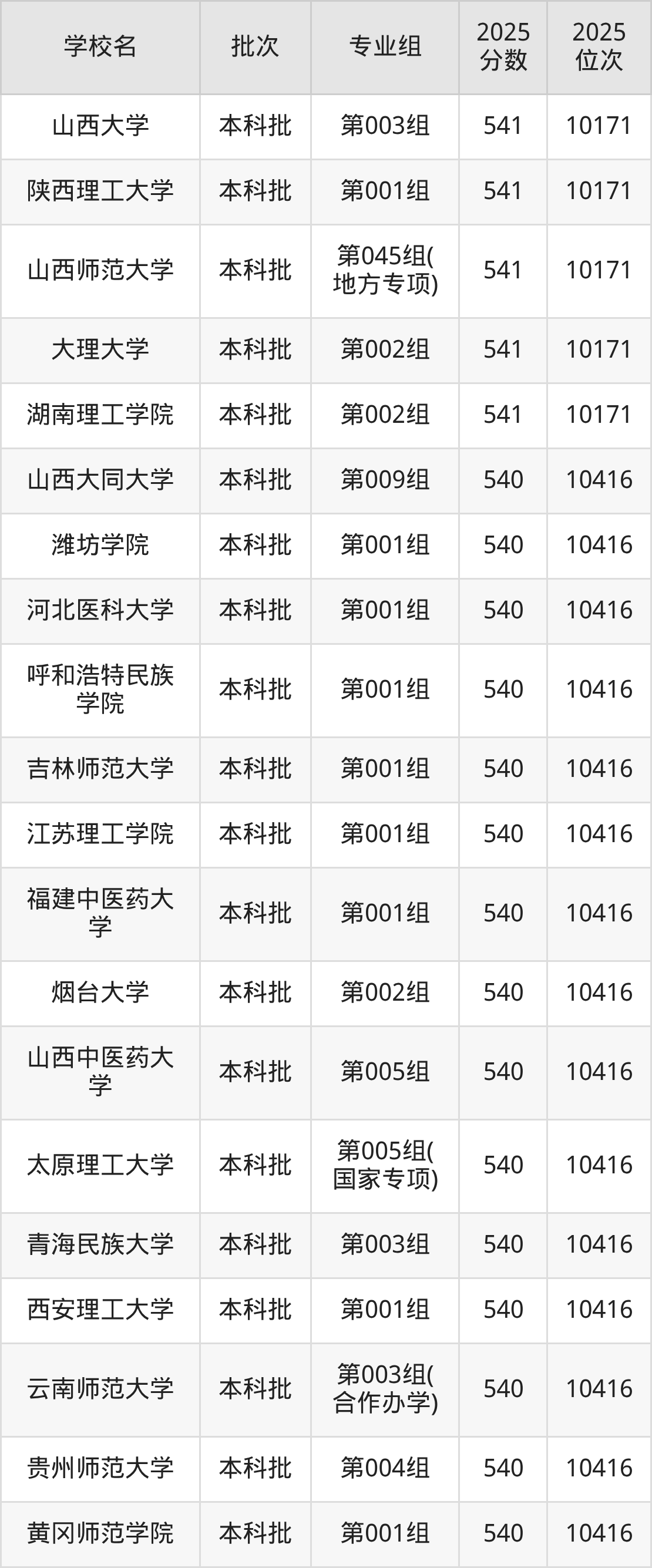 2025年山西高考历史类540分(10172名~10416名)能上的大学有河北医科大学第001组、呼和浩特民族学院第001组、吉林师范大学第001组、江苏理工学院第001组等。
