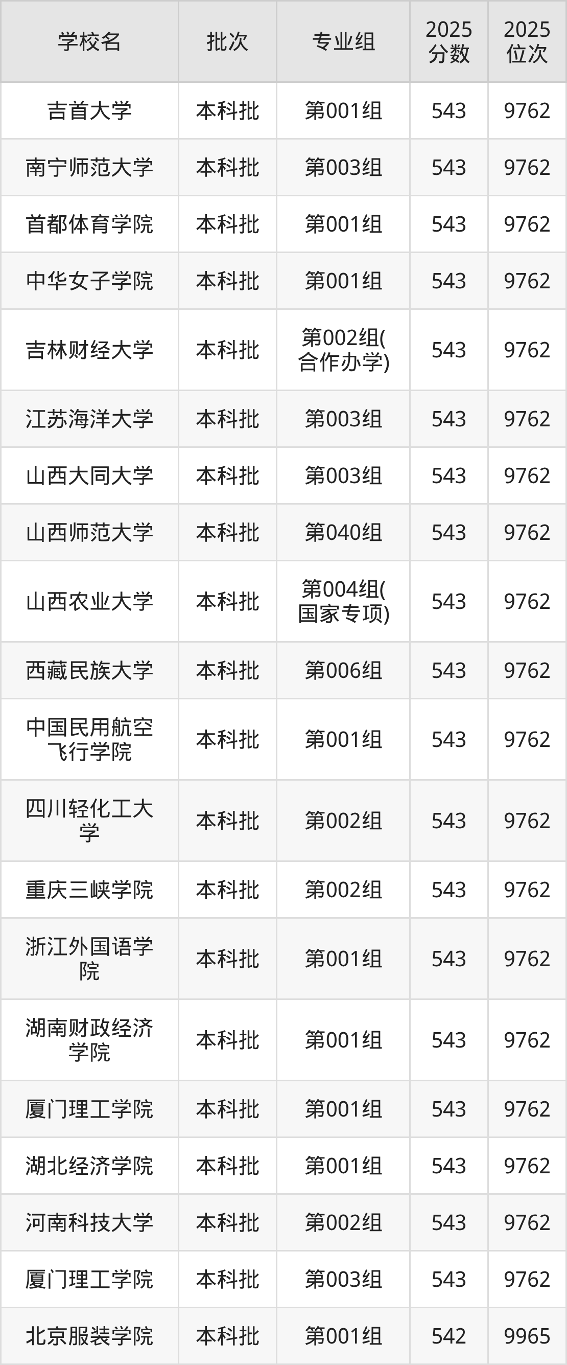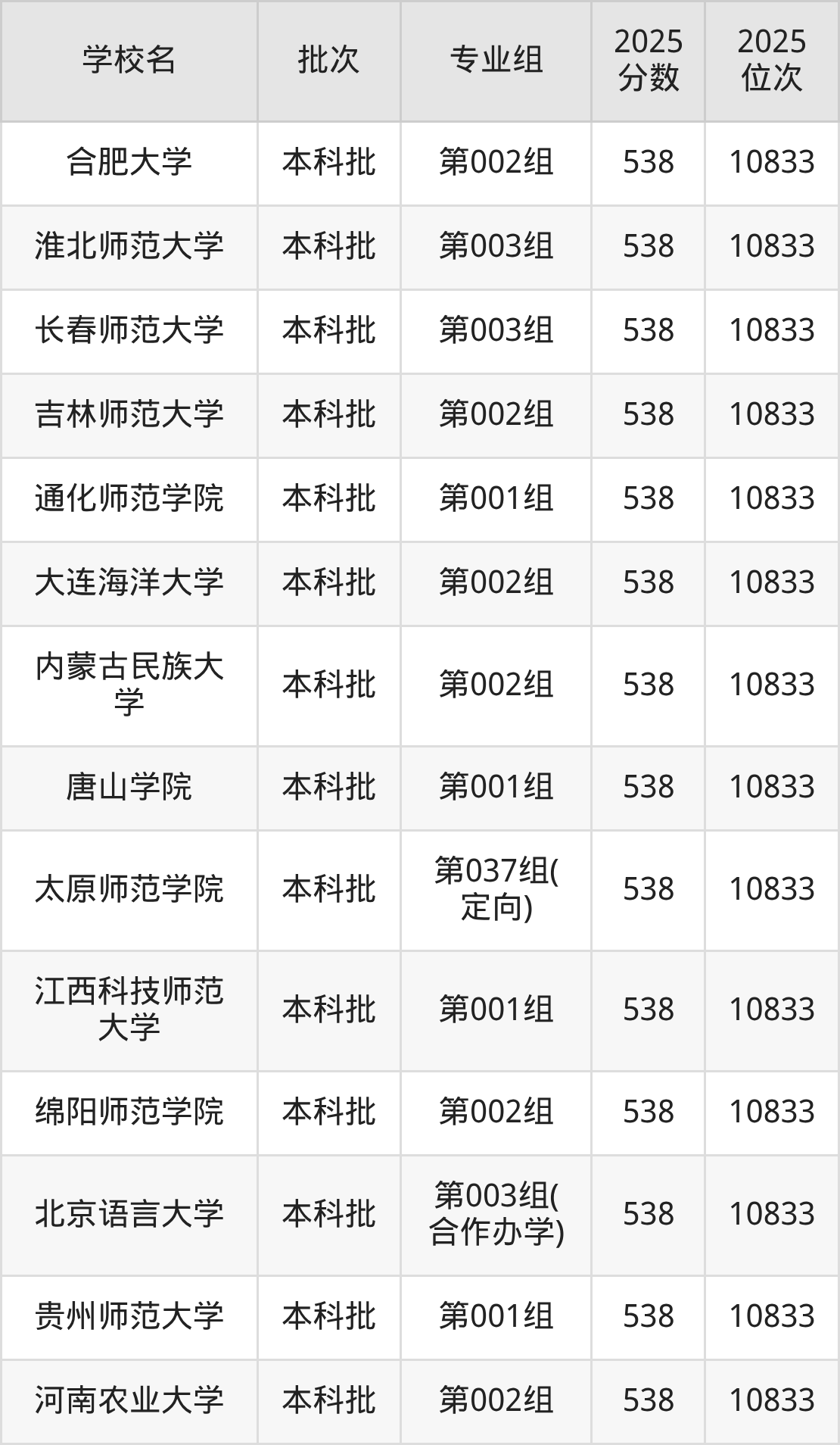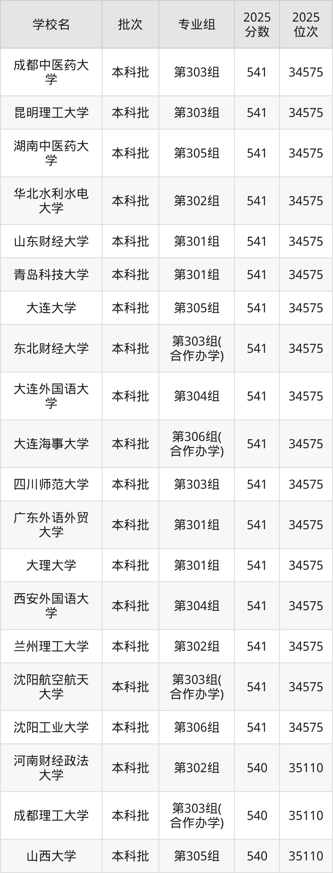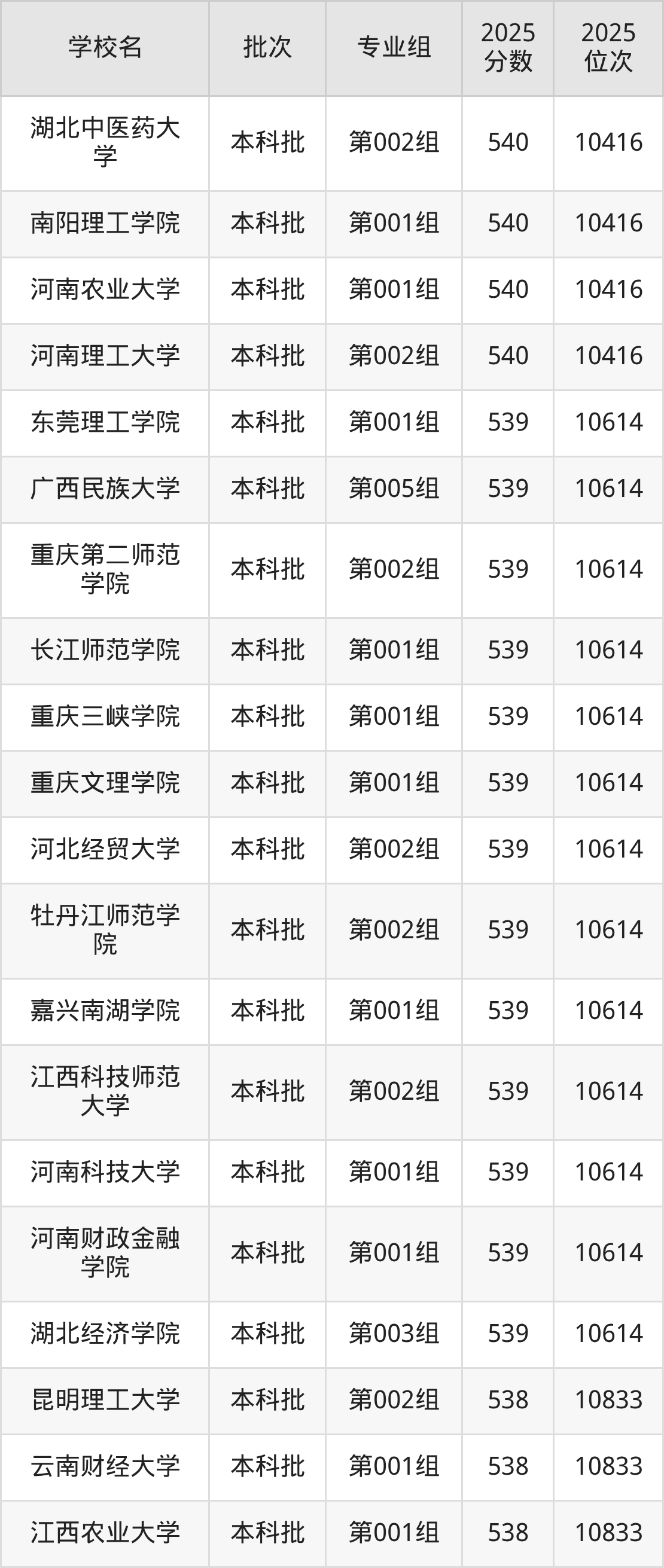 2025年山西高考历史类540分(10172名~10416名)能上的大学有河北医科大学第001组、呼和浩特民族学院第001组、吉林师范大学第001组、江苏理工学院第001组等。
