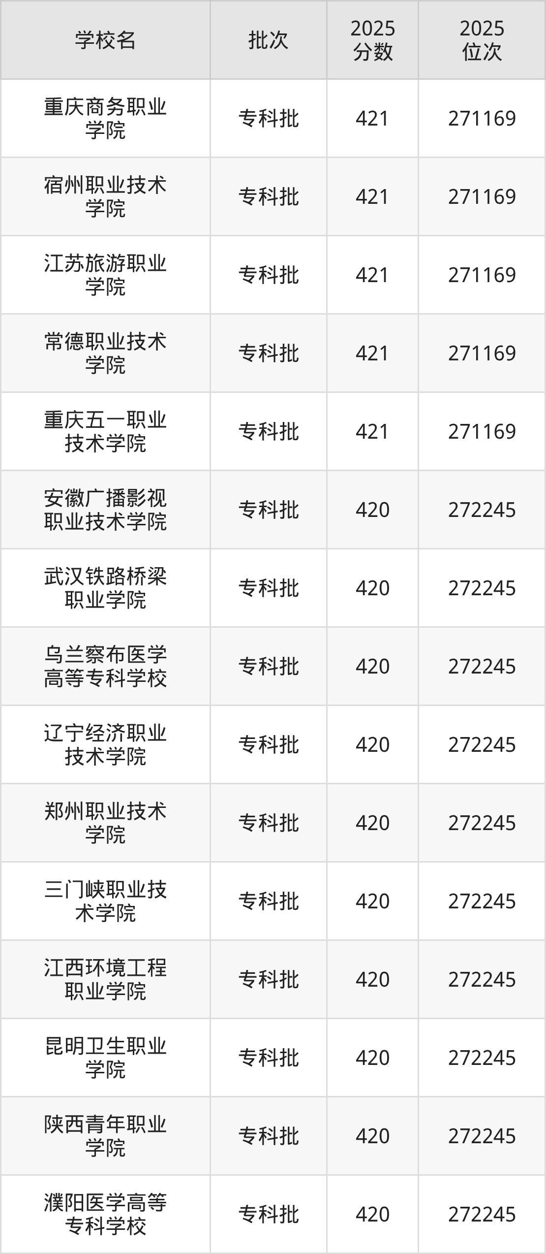 2025年河北高考物理类420分(271170名~272245名)能上的大学有江西环境工程职业学院、乌兰察布医学高等专科学校、辽宁经济职业技术学院、郑州职业技术学院等。
