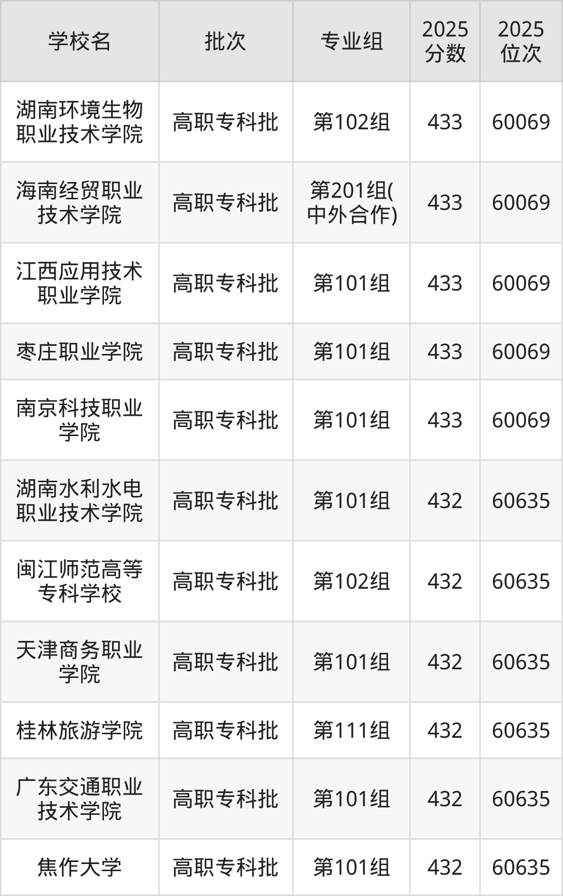 2025年湖南高考历史类432分(60070名~60635名)能上的大学有天津商务职业学院第101组、闽江师范高等专科学校第102组、焦作大学第101组、广东交通职业技术学院第101组等。