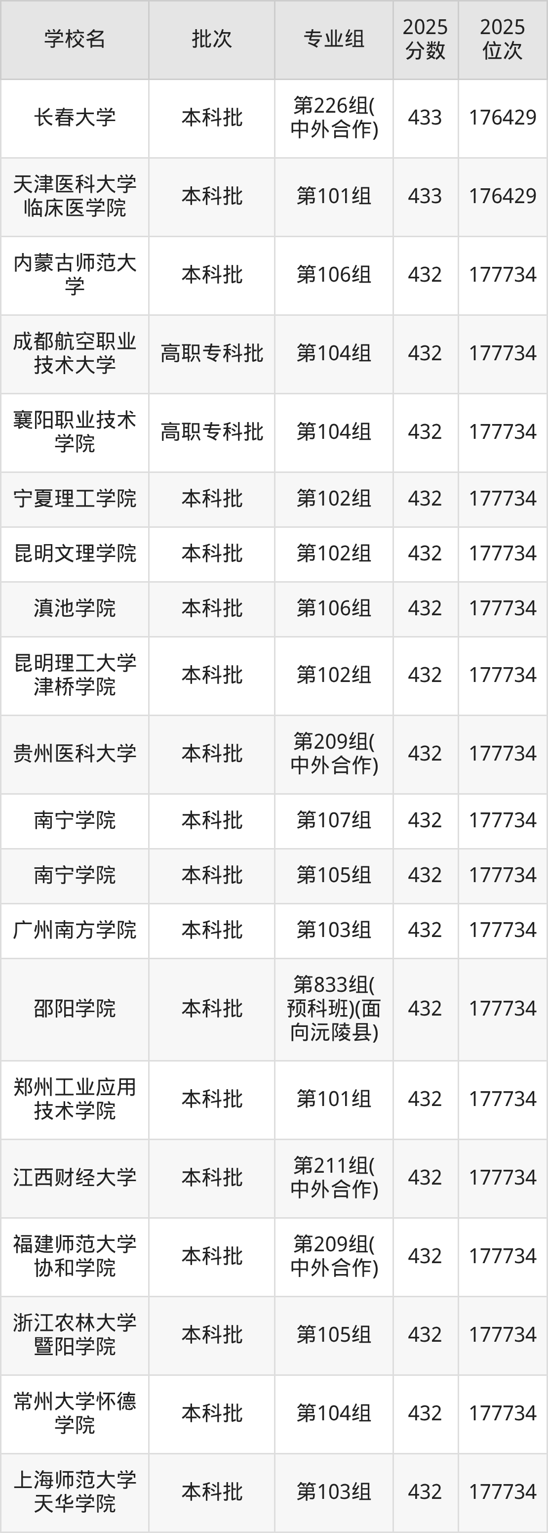2025年湖南高考物理类432分(176430名~177734名)能上的大学有内蒙古师范大学第106组、吉林医药学院第206组(中外合作)、齐齐哈尔工程学院第104组、上海师范大学天华学院第103组等。