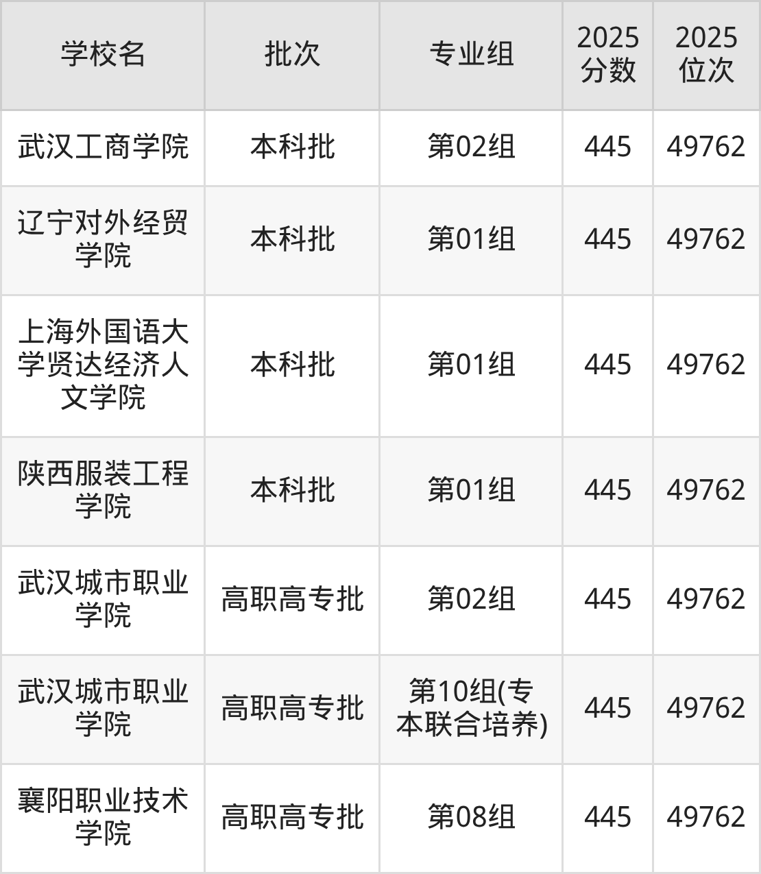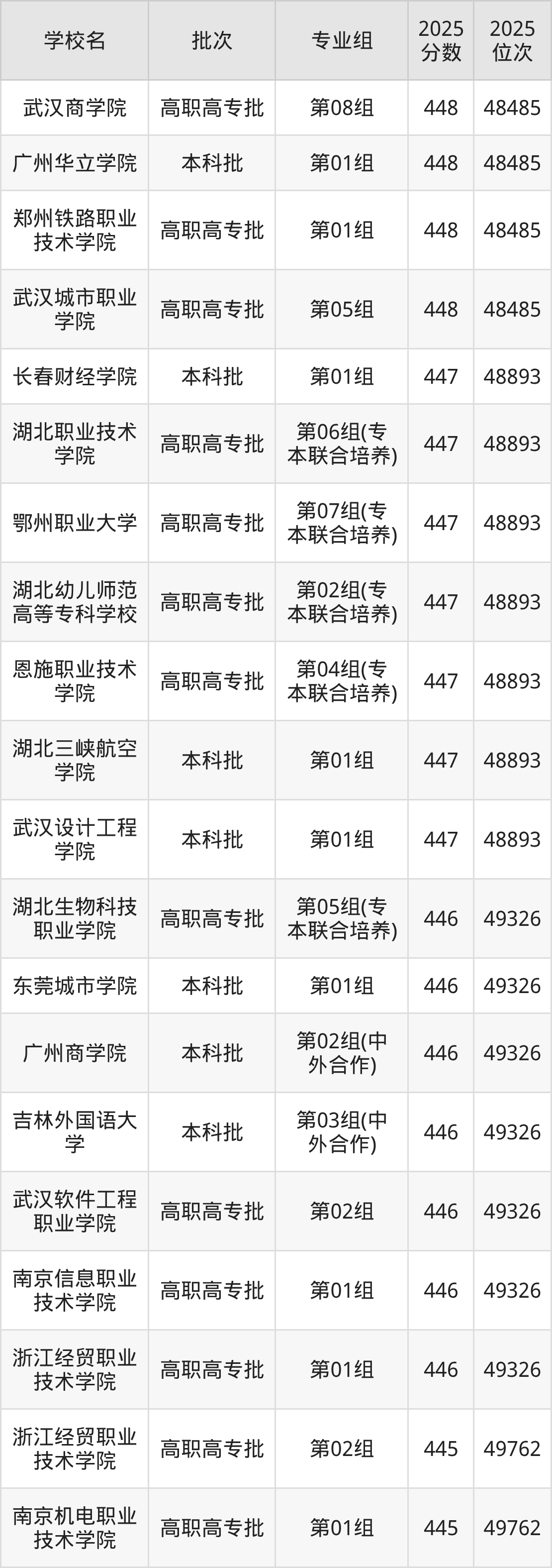 2025年湖北高考历史类446分(48894名~49326名)能上的大学有吉林外国语大学第03组(中外合作)、广州商学院第02组(中外合作)、东莞城市学院第01组、湖北生物科技职业学院第05组(专本联合培养)等。
