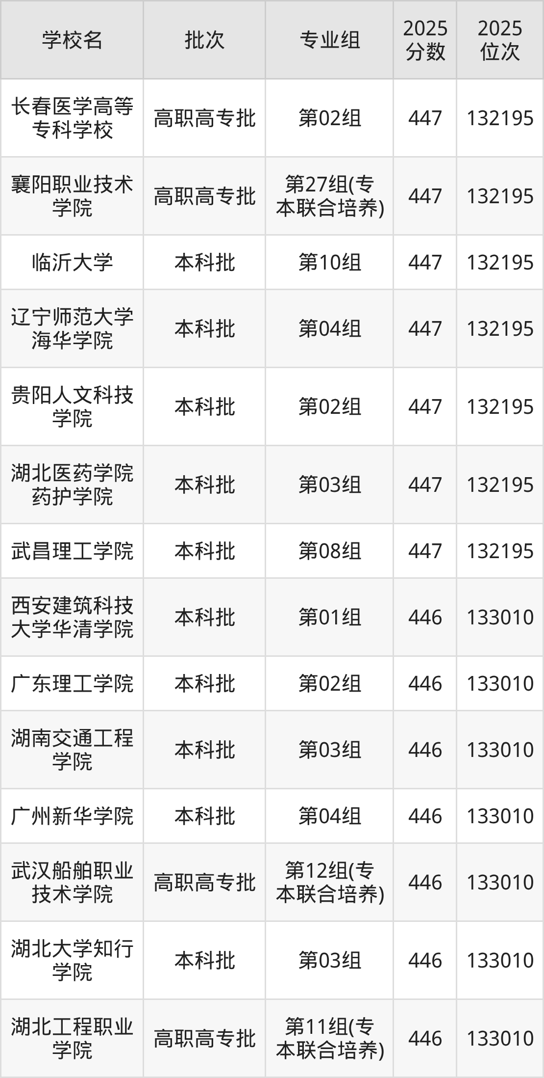 2025年湖北高考物理类446分(132196名~133010名)能上的大学有湖北大学知行学院第03组、湖南交通工程学院第03组、广东理工学院第02组、广州新华学院第04组等。