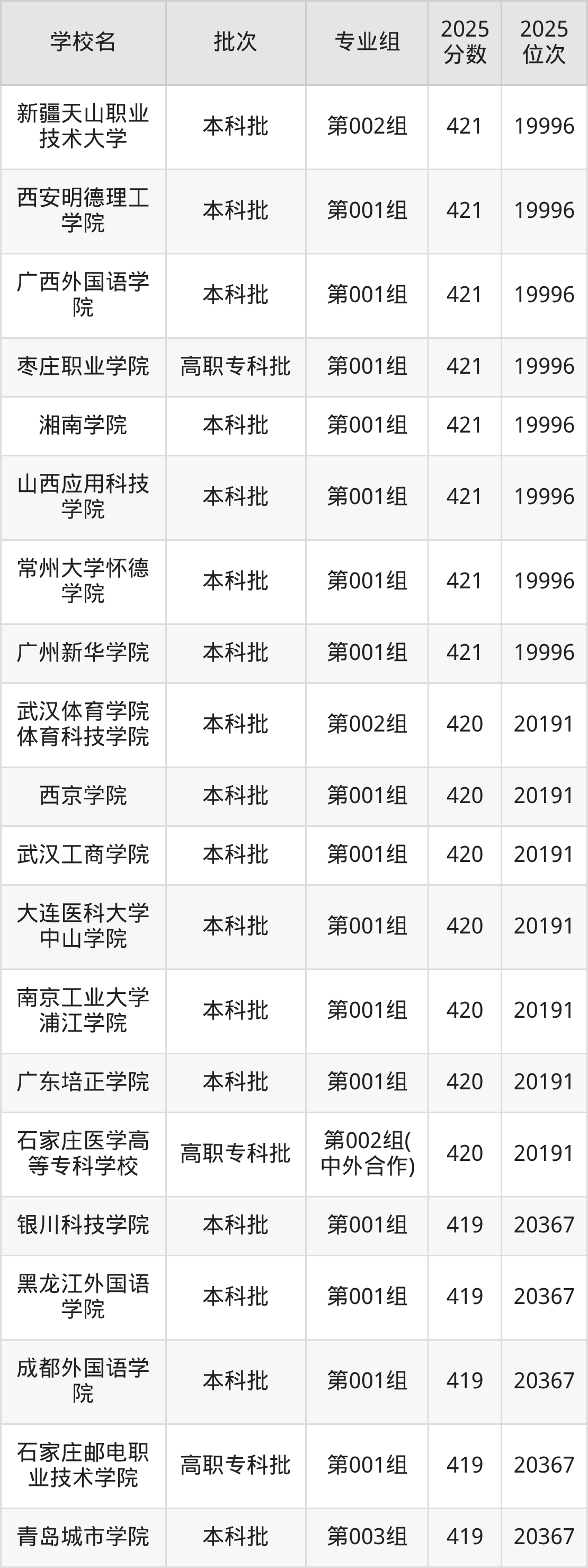 2025年黑龙江高考历史类421分(19801名~19996名)能上的大学有湘南学院第001组、山西应用科技学院第001组、常州大学怀德学院第001组、广州新华学院第001组等。