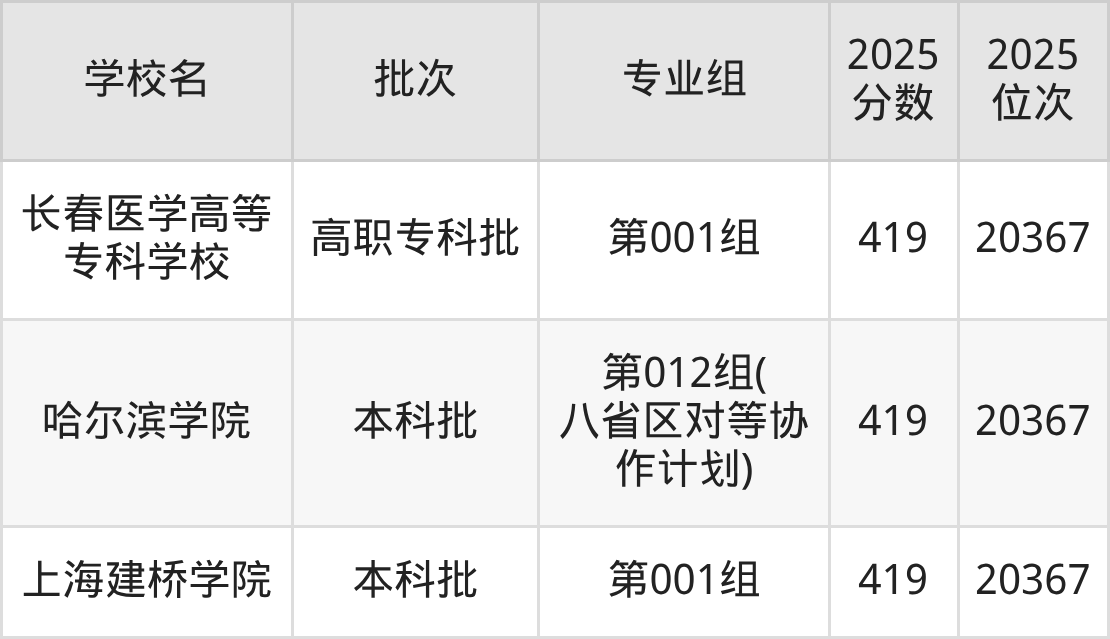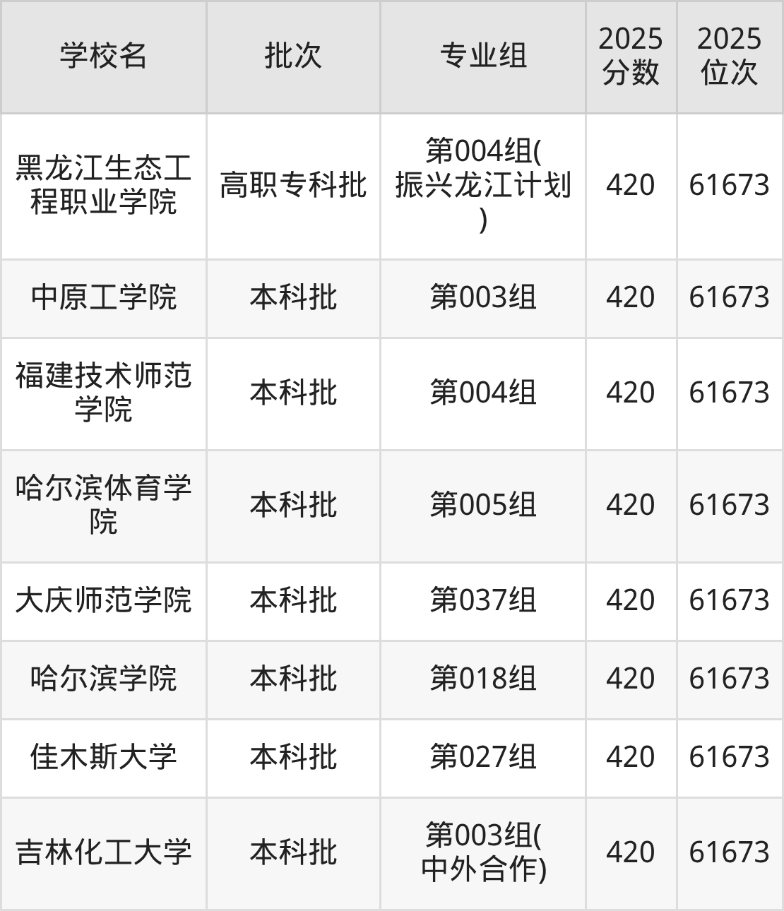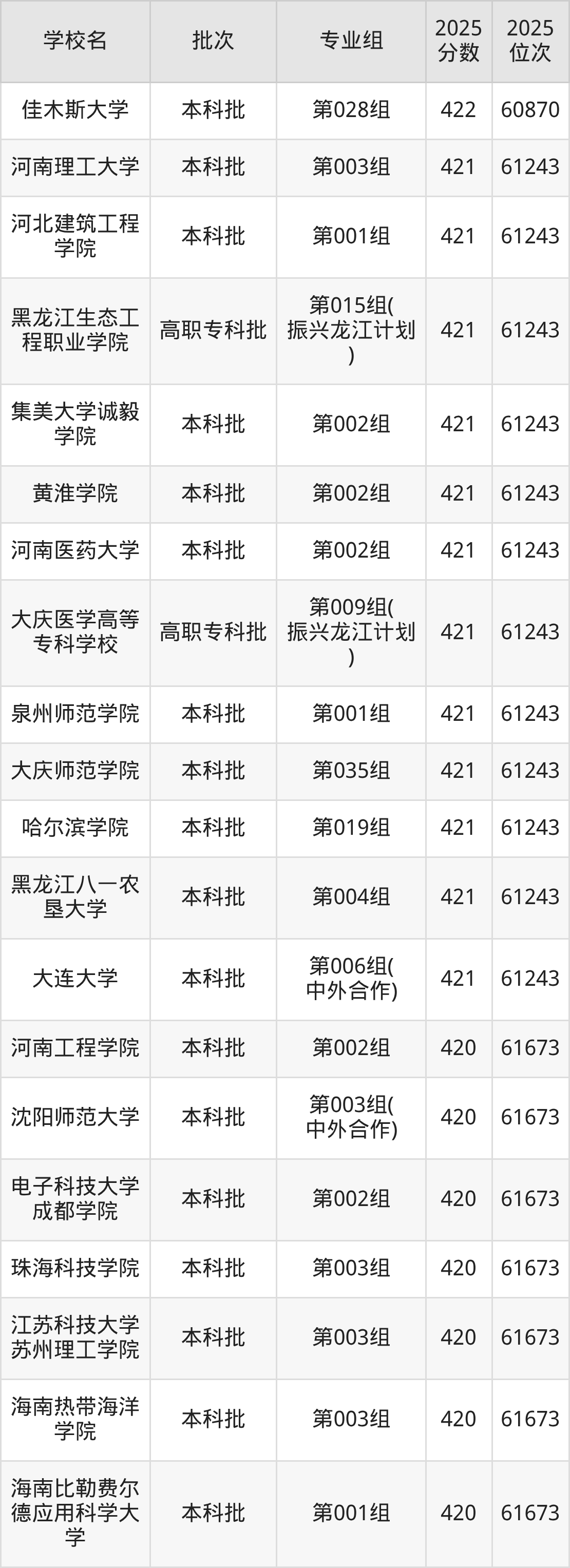 2025年黑龙江高考物理类421分(60871名~61243名)能上的大学有河北建筑工程学院第001组、大连大学第006组(中外合作)、黑龙江八一农垦大学第004组、哈尔滨学院第019组等。