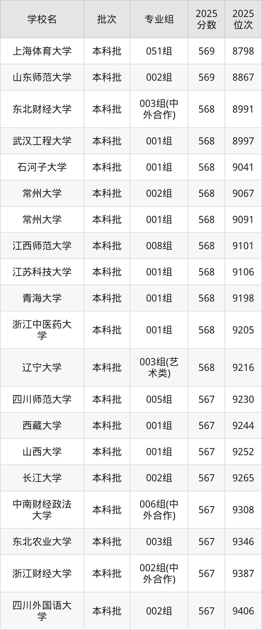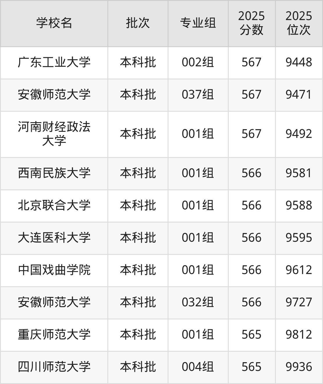 2025年安徽高考历史类567分(9225名~9504名)能上的大学有长江大学002组、东北农业大学003组、广东工业大学002组、河南财经政法大学001组等。