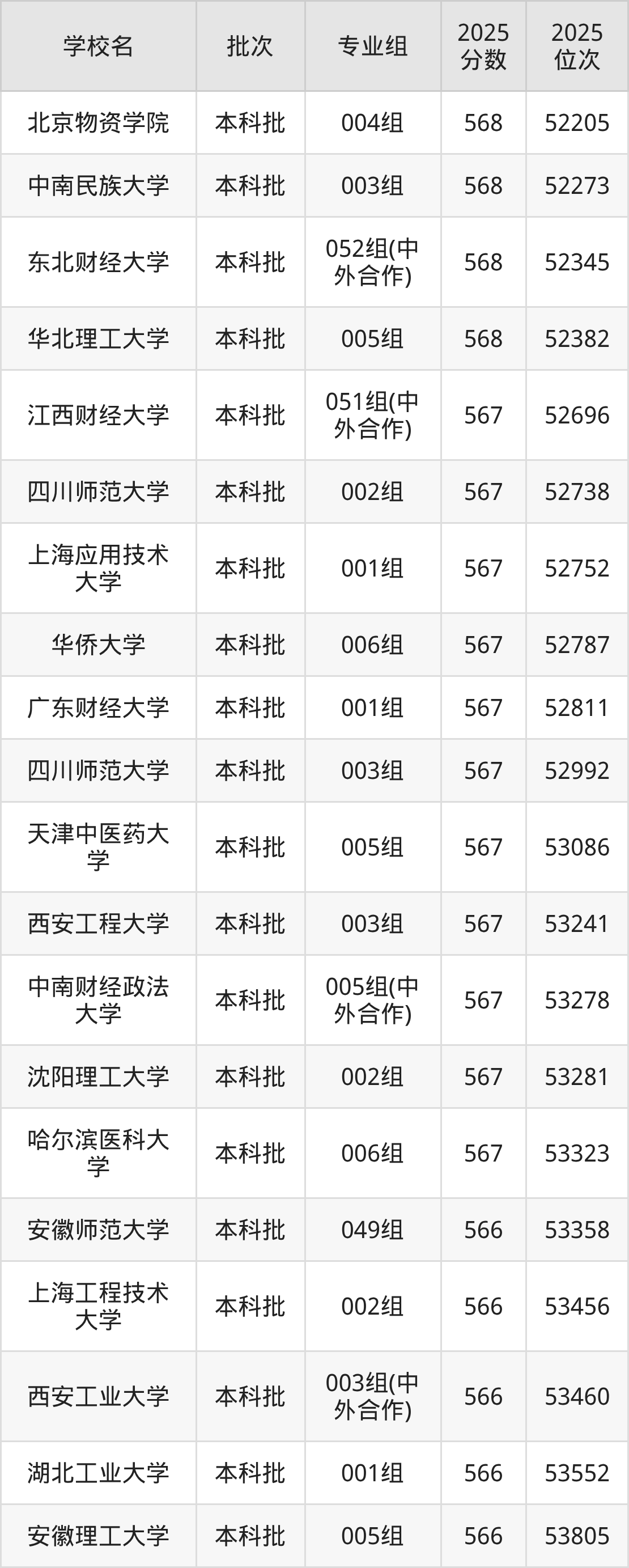 2025年安徽高考物理类567分(52417名~53330名)能上的大学有广东财经大学001组、哈尔滨医科大学006组、华侨大学006组、江西财经大学051组(中外合作)等。