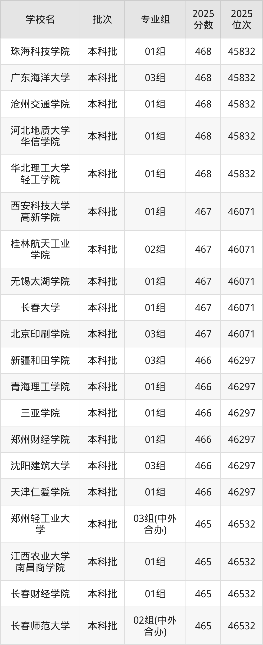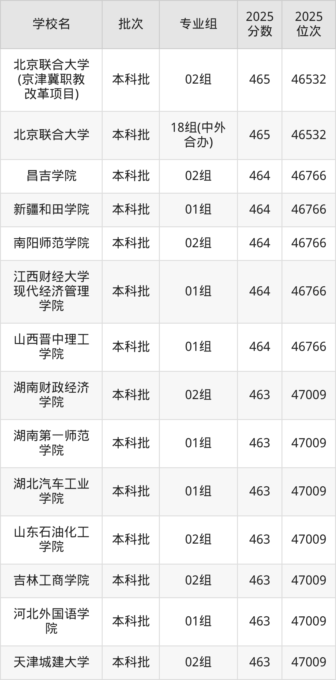 2025年北京高考465分(46298名~46532名)能上的大学有北京联合大学18组(中外合办)、北京联合大学(京津冀职教改革项目)02组、长春师范大学02组(中外合办)、长春财经学院01组等。