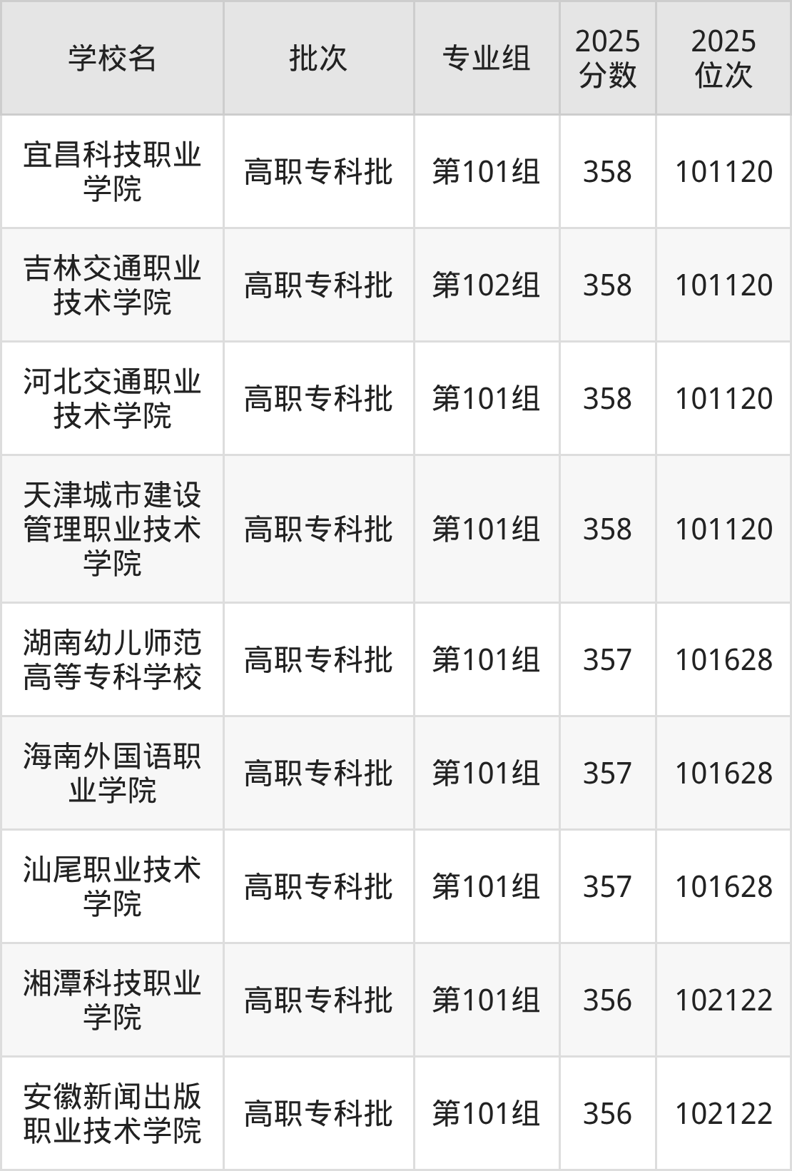 另外录取位次低于该区间(较稳妥)的有湘潭科技职业学院第101组(102122名)、安徽新闻出版职业技术学院第101组(102122名)等;录取位次高于该区间(可冲)的有天津城市建设管理职业技术学院第101组(101120名)、河北交通职业技术学院第101组(101120名)等。