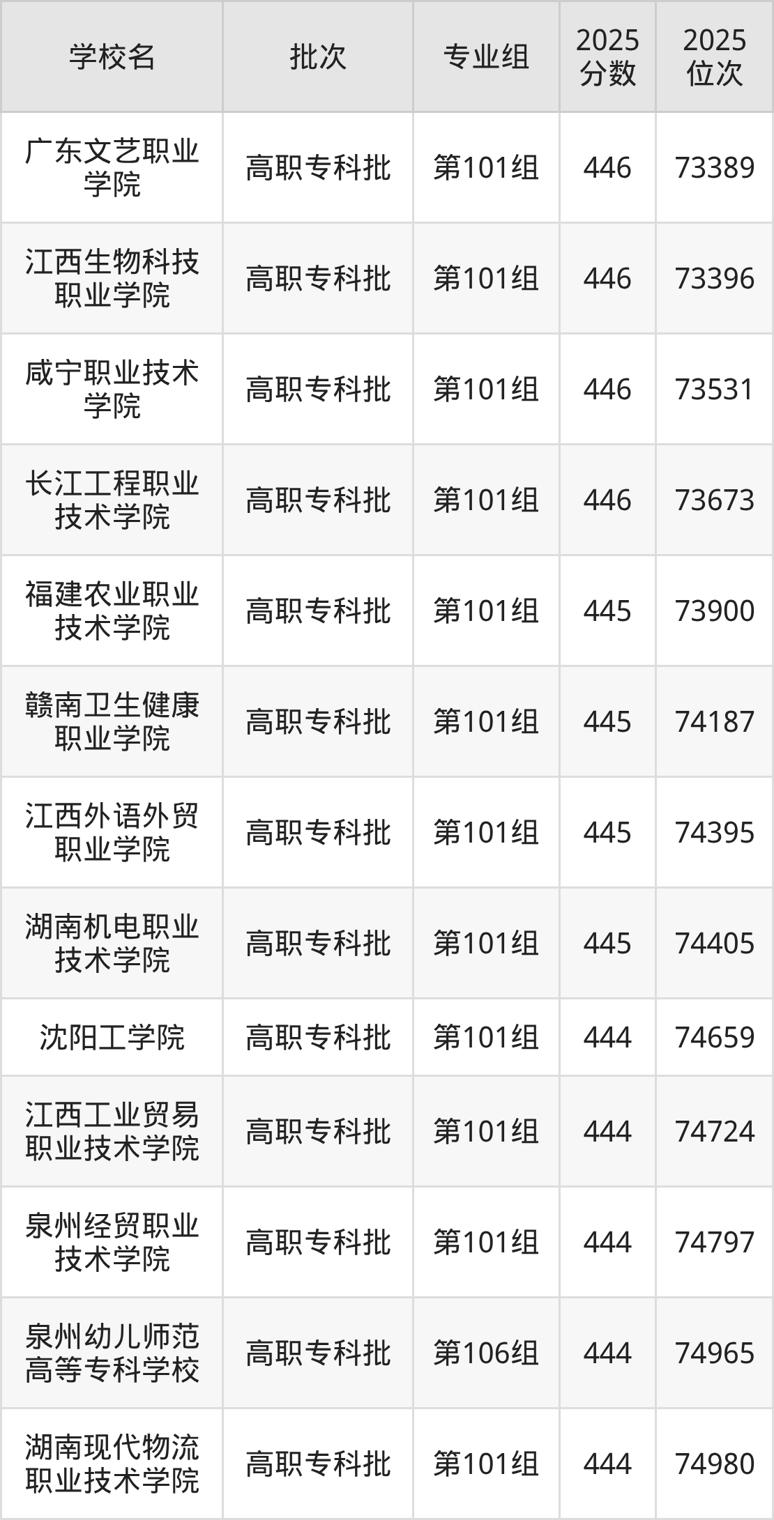 2025年江西高考历史类445分(73872名~74506名)能上的大学有福建农业职业技术学院第101组、湖南机电职业技术学院第101组、江西外语外贸职业学院第101组、赣南卫生健康职业学院第101组。