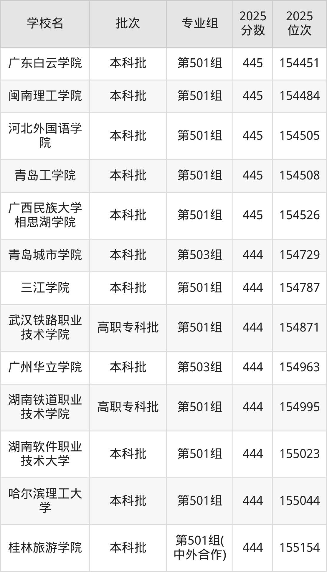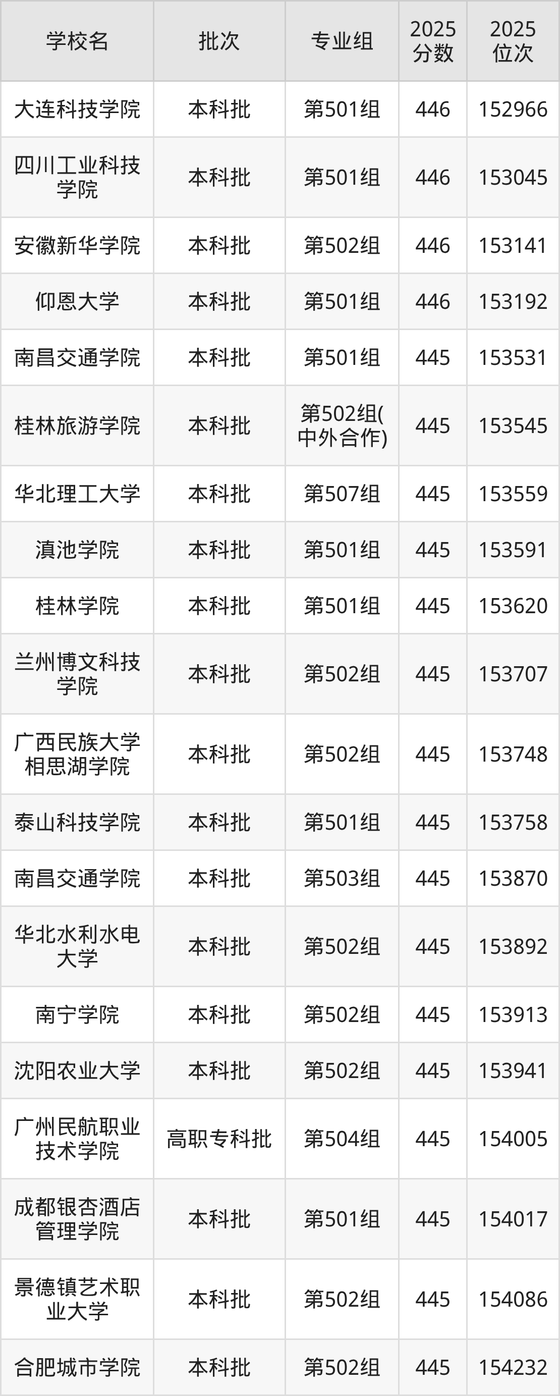 2025年江西高考物理类445分(153467名~154661名)能上的大学有沈阳农业大学第502组、华北理工大学第507组、华北水利水电大学第502组、合肥城市学院第502组等。