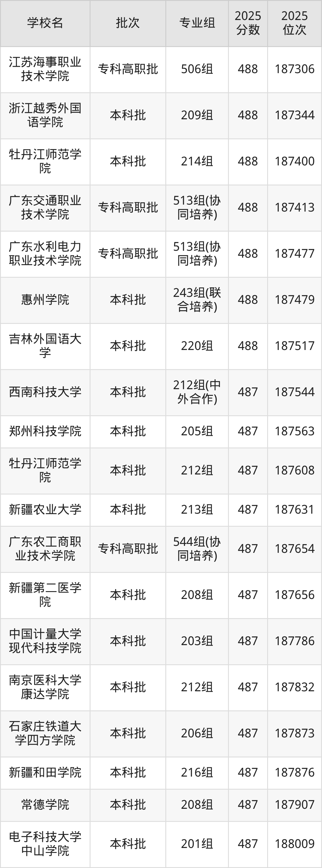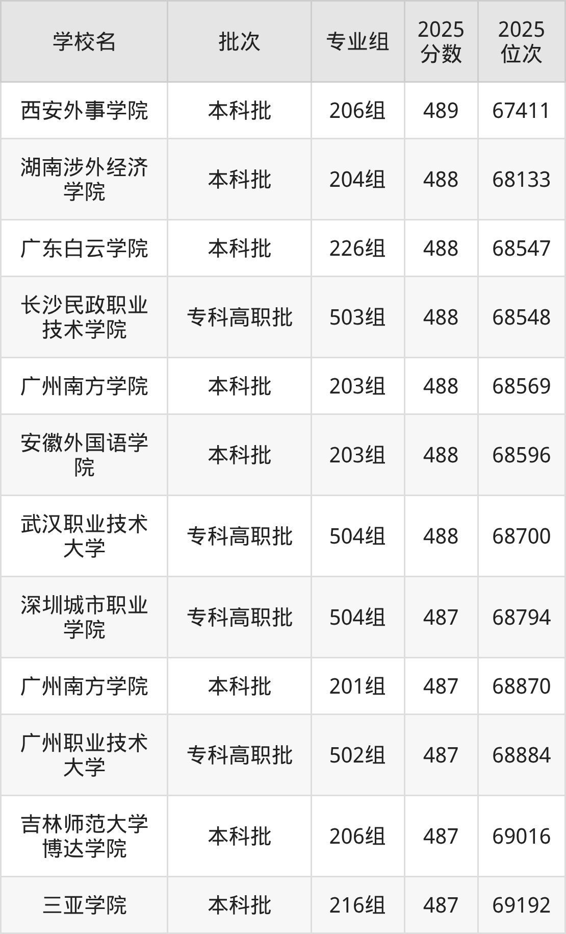 2025年广东高考历史类488分(67830名~68703名)能上的大学有广东白云学院226组、湖南涉外经济学院204组、广州南方学院203组、安徽外国语学院203组等。