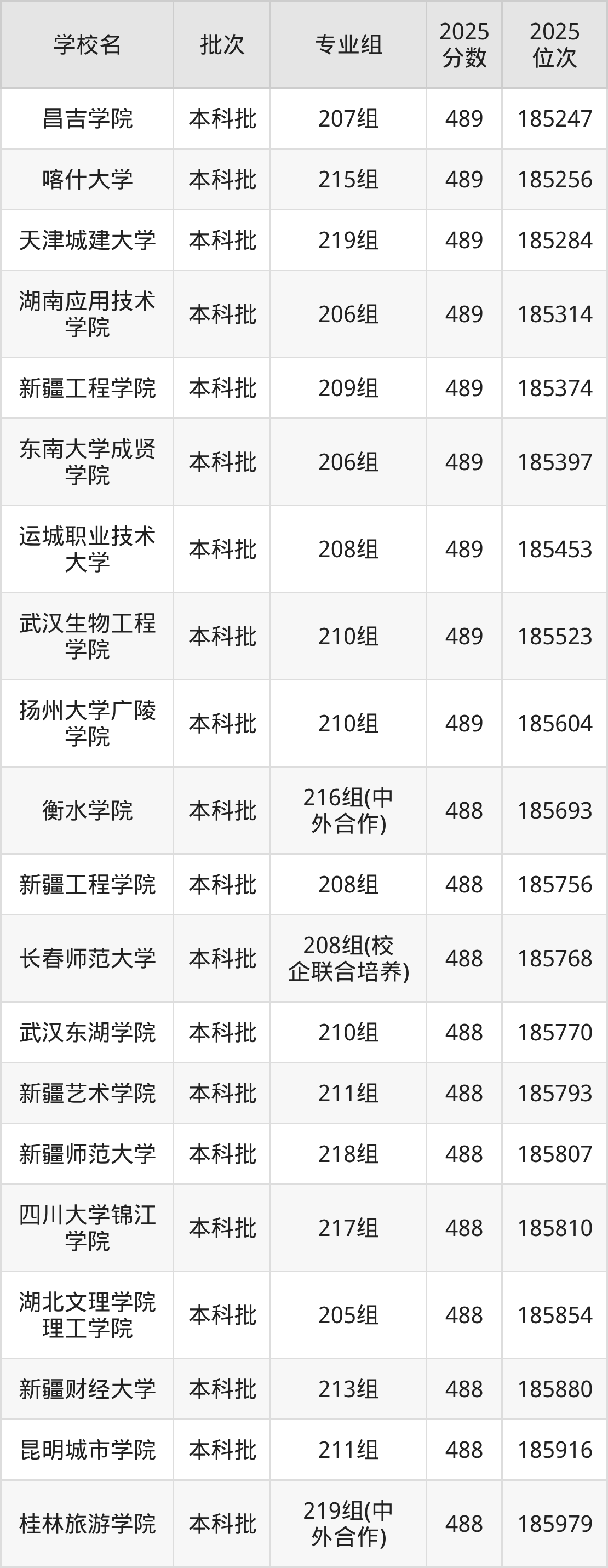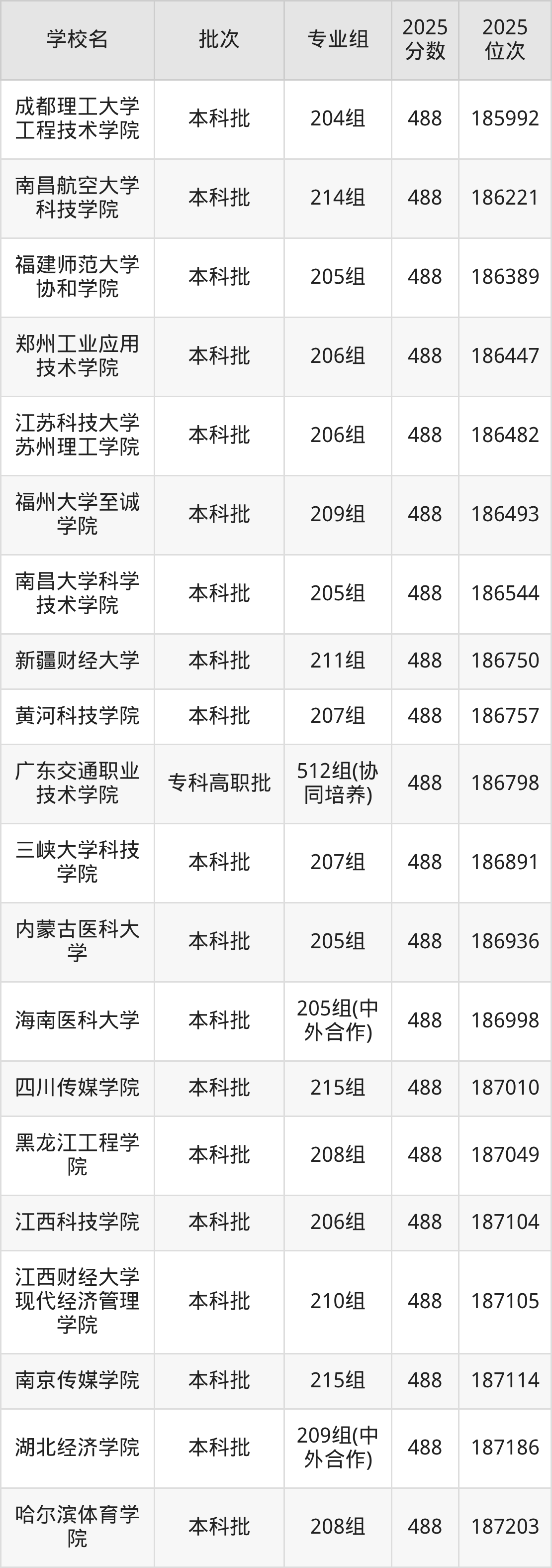 2025年广东高考物理类488分(185689名~187524名)能上的大学有衡水学院216组(中外合作)、内蒙古医科大学205组、长春师范大学208组(校企联合培养)、牡丹江师范学院214组等。