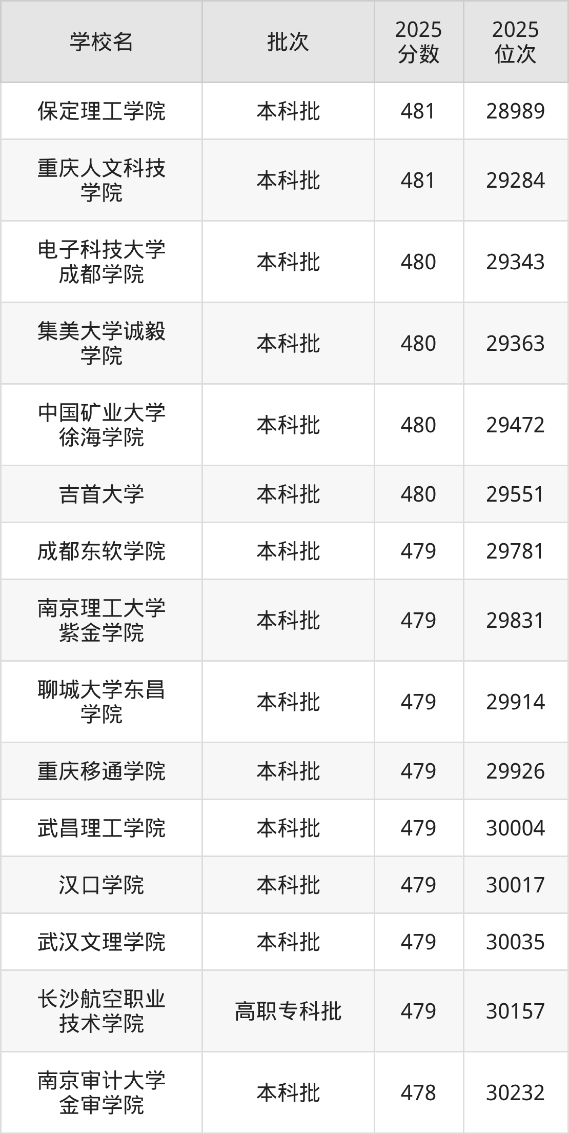 另外录取位次低于该区间(较稳妥)的有成都东软学院(29781名)、南京理工大学紫金学院(29831名)等;录取位次高于该区间(可冲)的有重庆人文科技学院(29284名)、保定理工学院(28989名)等。