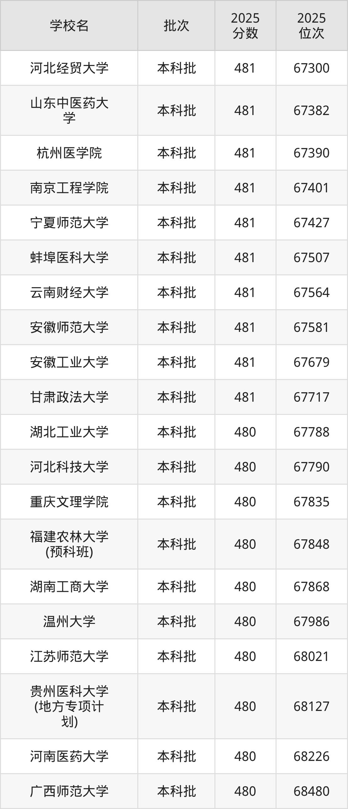 2025年贵州高考物理类480分(67734名~68583名)能上的大学有贵州医科大学(地方专项计划)、湖南工商大学、福建农林大学(预科班)、重庆文理学院等。