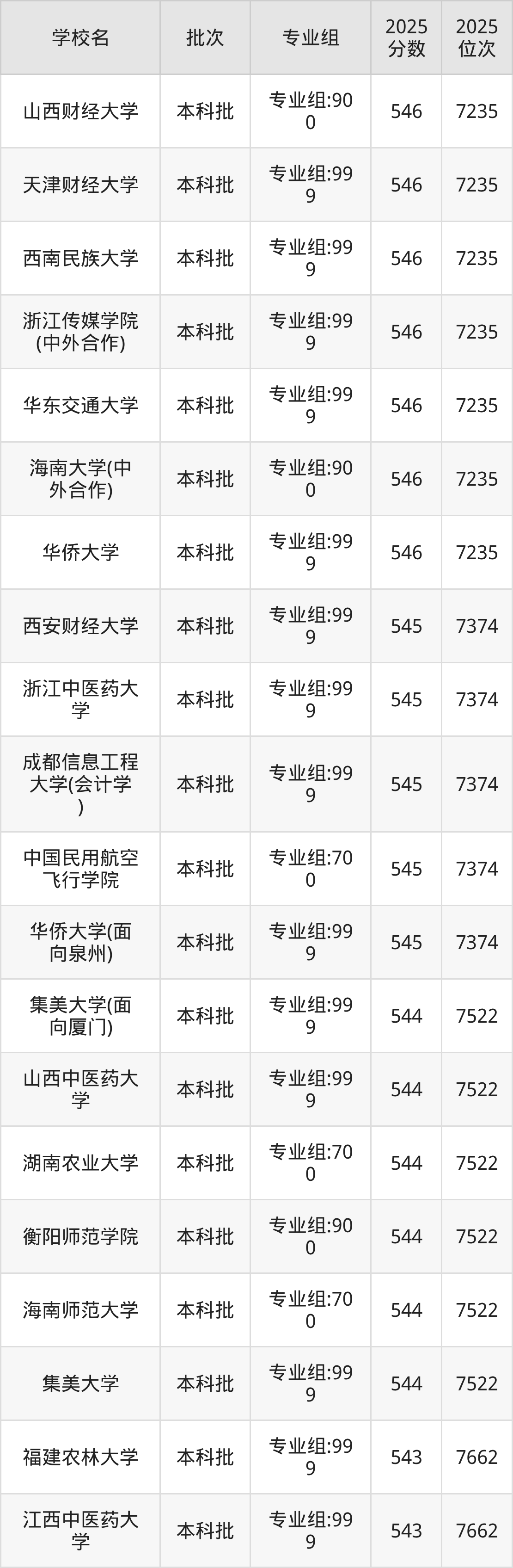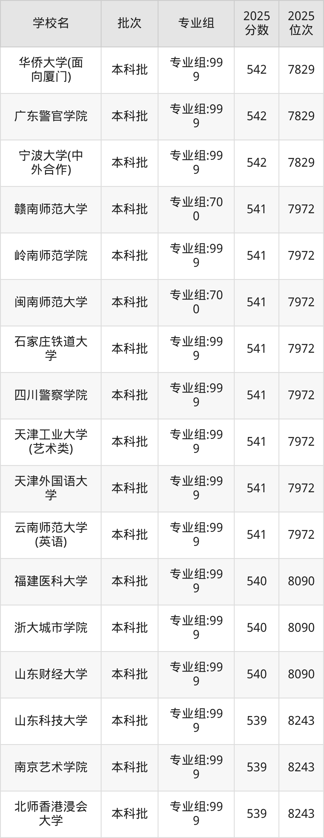 2025年福建高考历史类542分(7663名~7829名)能上的大学有华侨大学(面向厦门)专业组:999、广东警官学院专业组:999、宁波大学(中外合作)专业组:999。