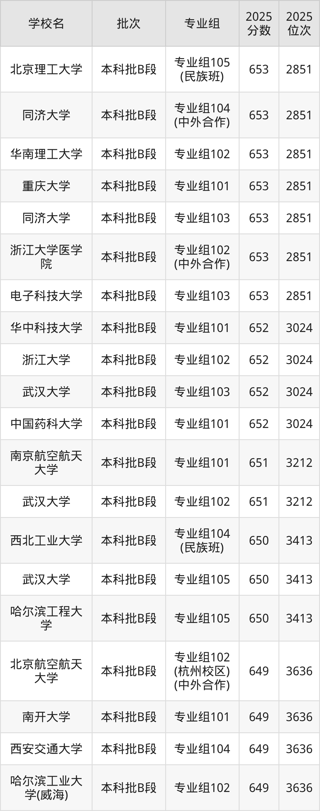 2025年四川高考物理类650分(3213名~3413名)能上的大学有哈尔滨工程大学专业组105、西北工业大学专业组104(民族班)、武汉大学专业组105。