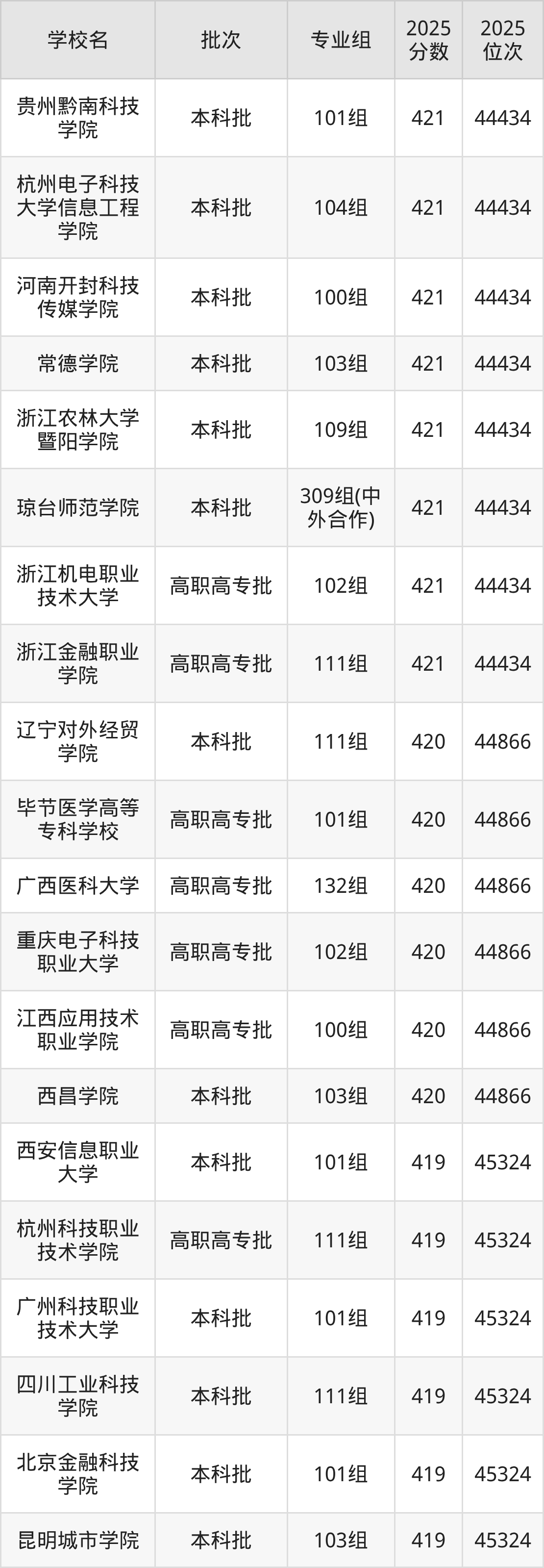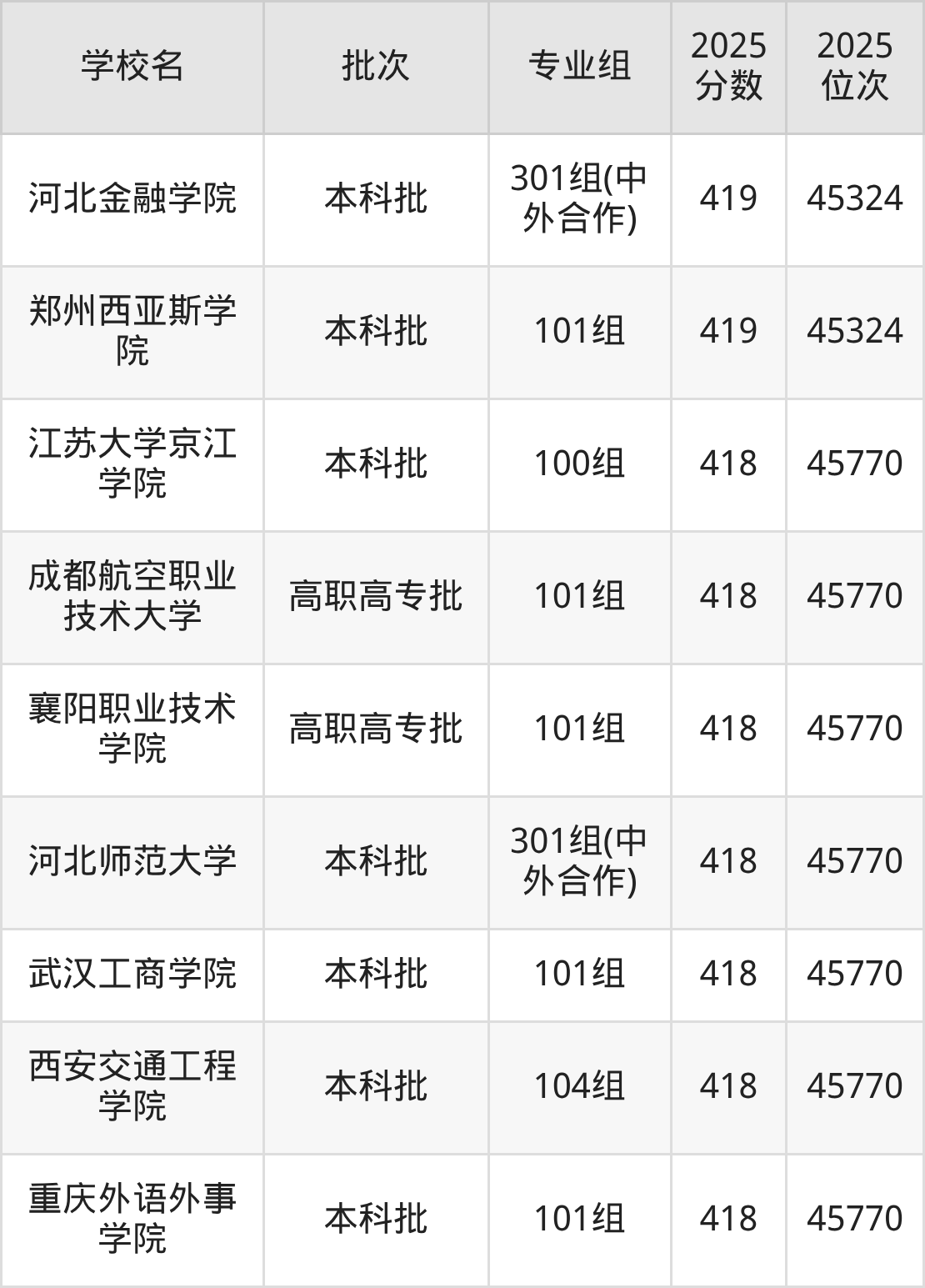 2025年广西高考历史类419分(44867名~45324名)能上的大学有河北金融学院301组(中外合作)、昆明城市学院103组、北京金融科技学院101组、广州科技职业技术大学101组等。