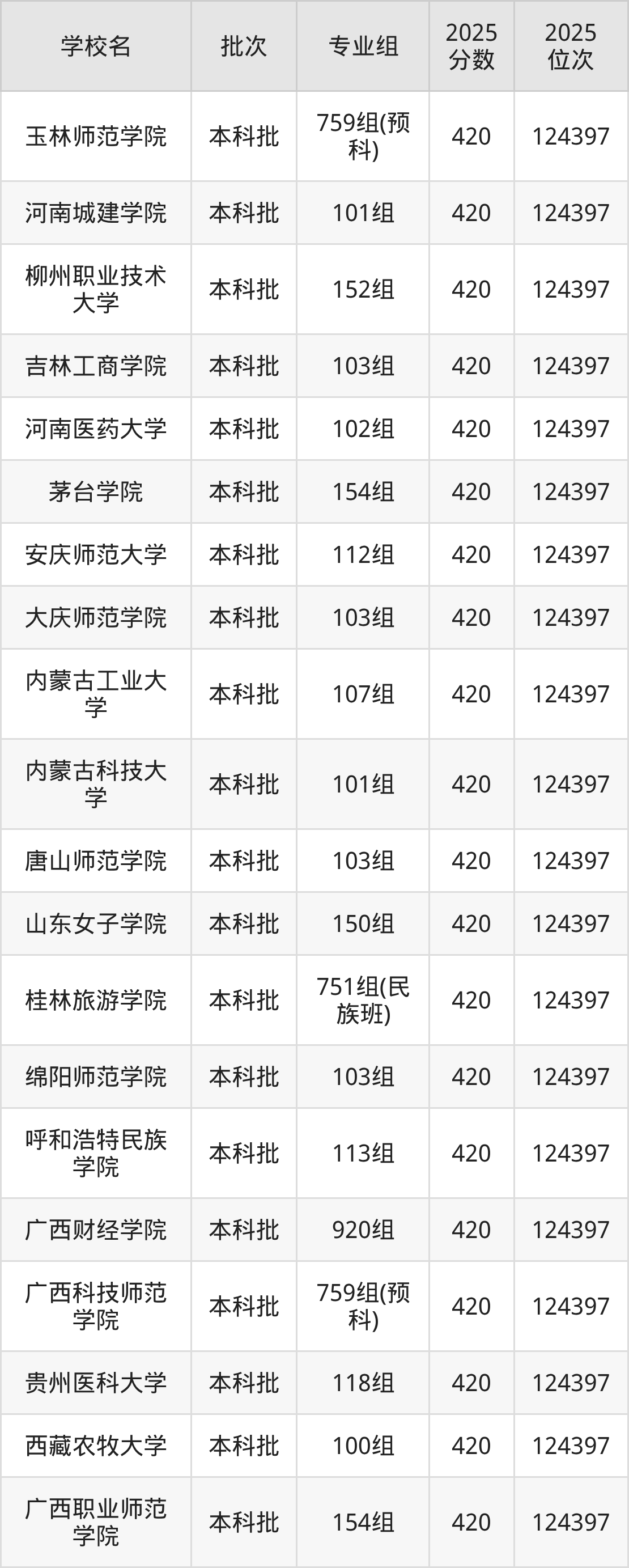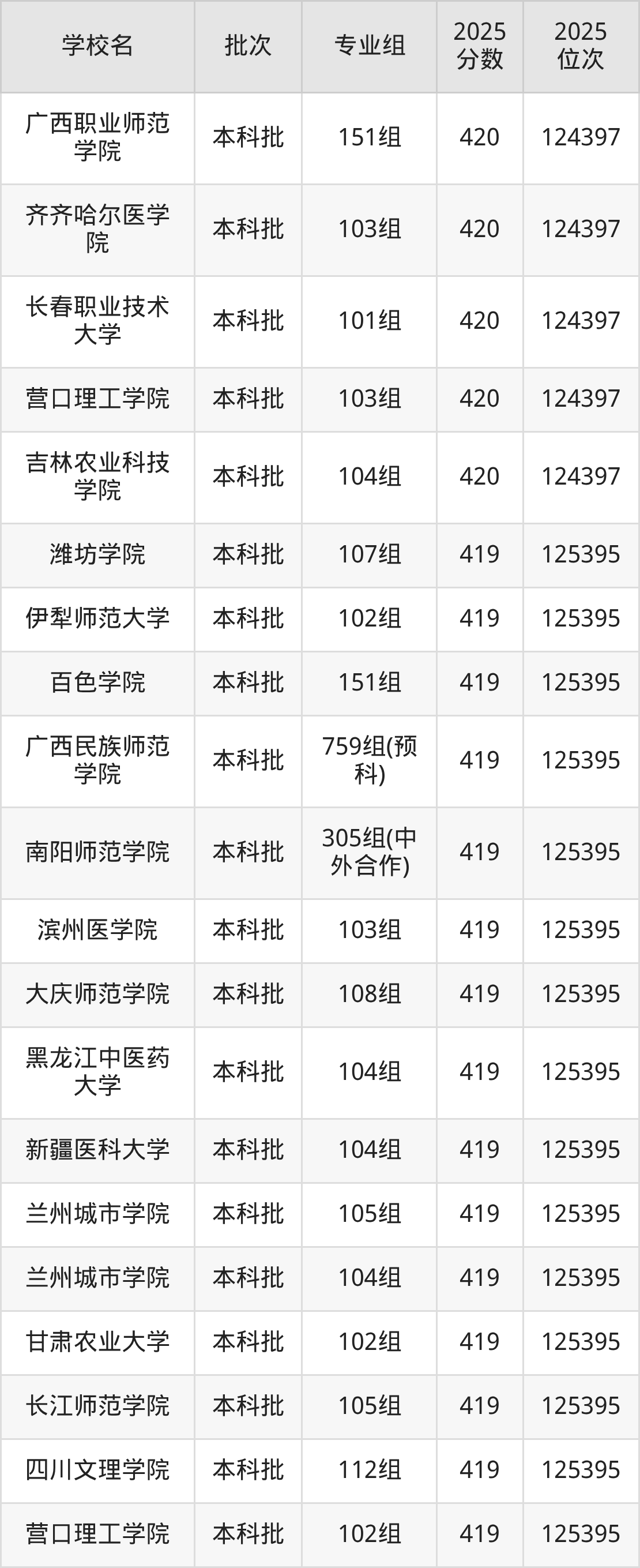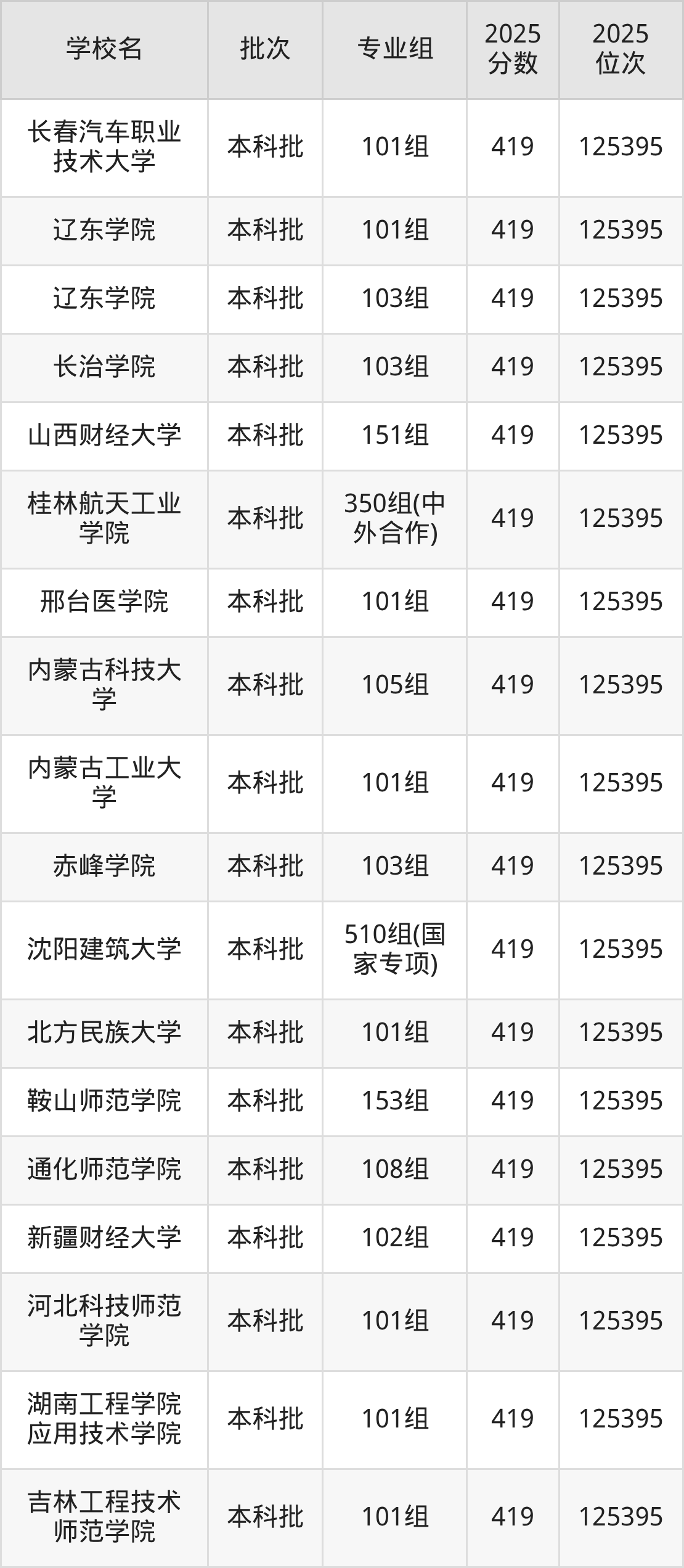 2025年广西高考物理类419分(124398名~125395名)能上的大学有长治学院103组、山西财经大学151组、内蒙古科技大学105组、内蒙古工业大学101组等。