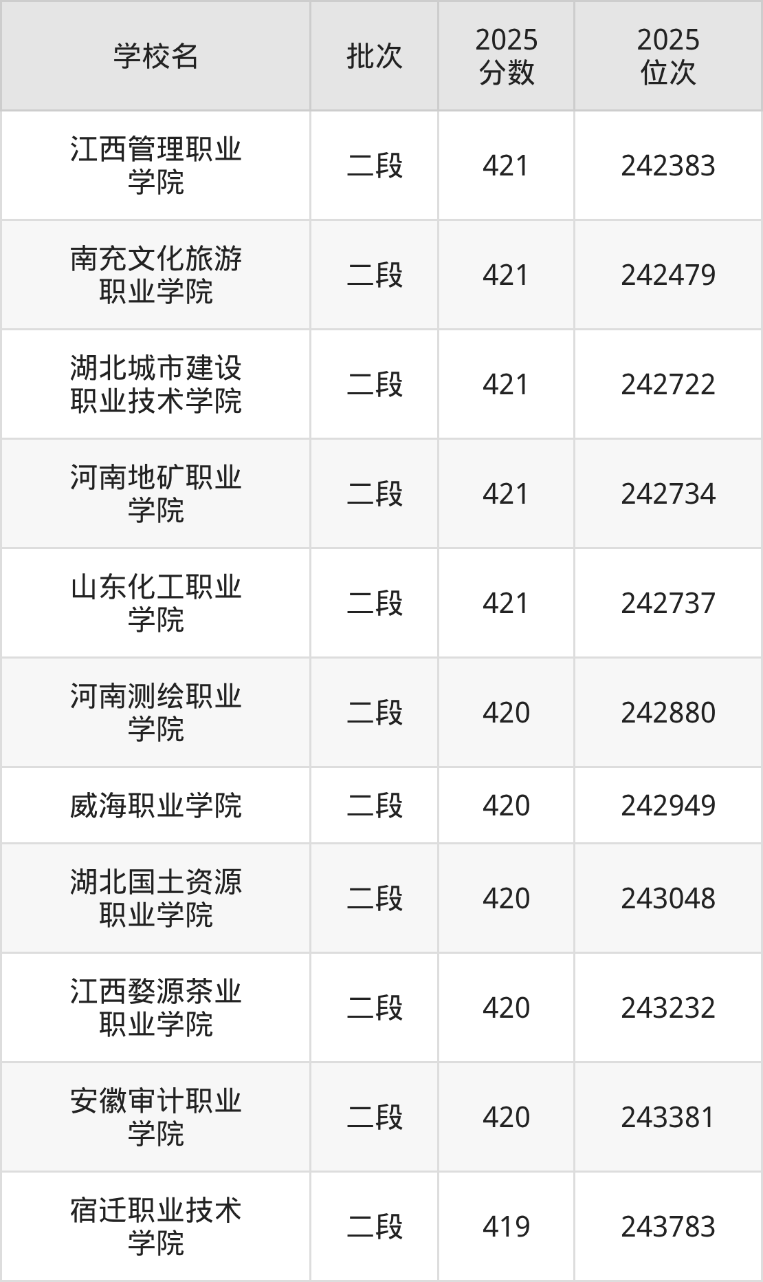 2025年浙江高考420分(242811名~243458名)能上的大学有江西婺源茶业职业学院、河南测绘职业学院、威海职业学院、湖北国土资源职业学院等。