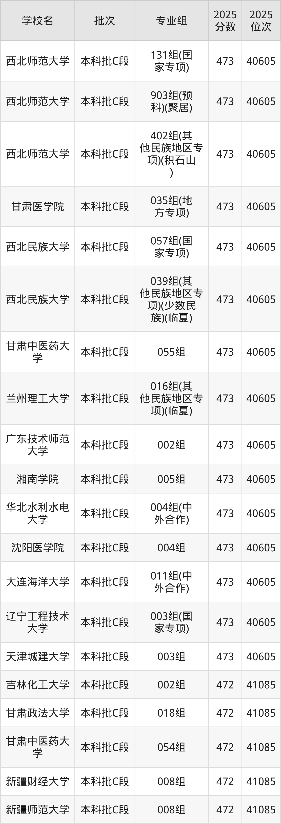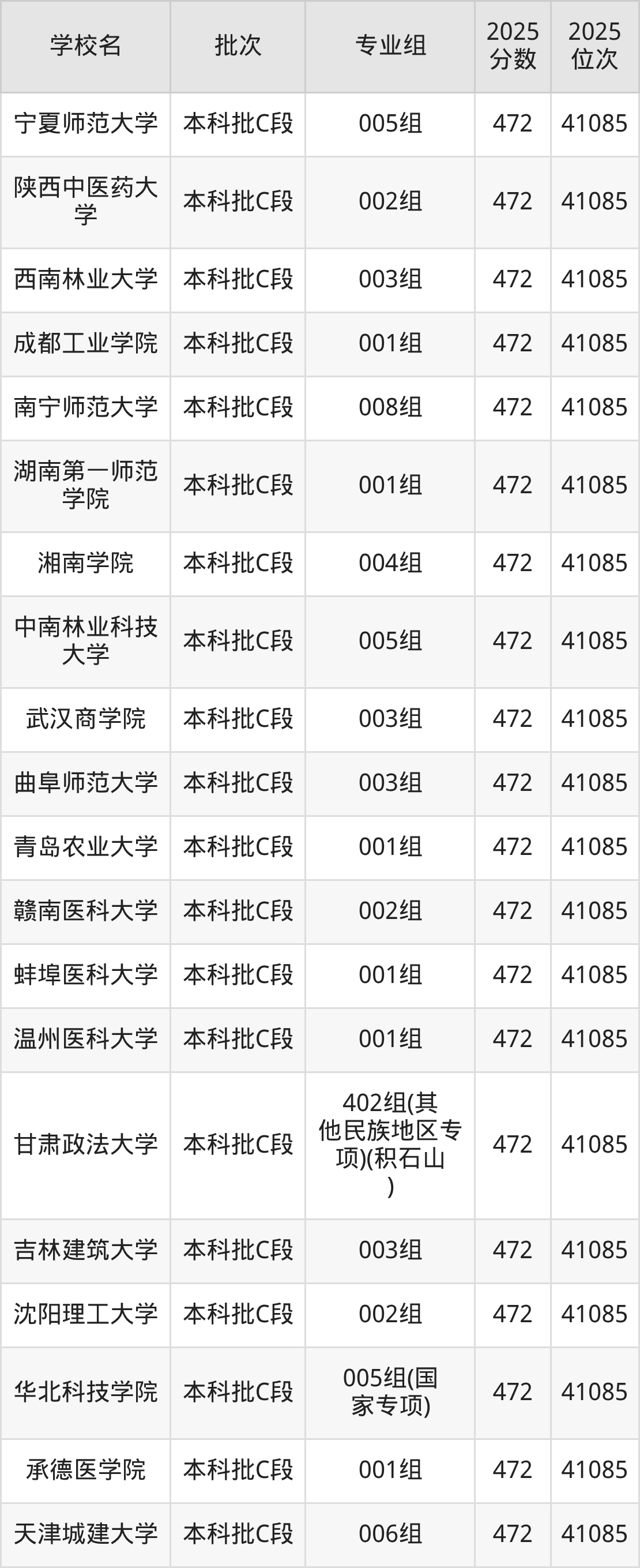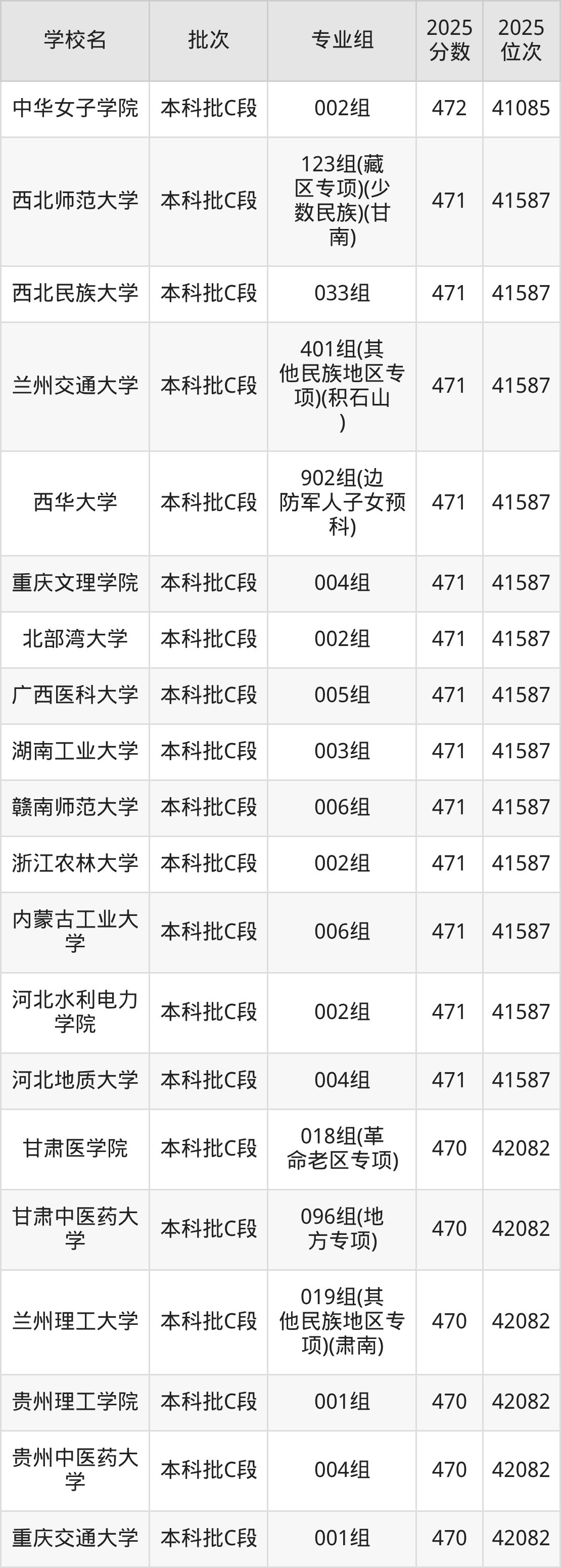 2025年甘肃高考物理类471分(41086名~41587名)能上的大学有河北地质大学004组、河北水利电力学院002组、内蒙古工业大学006组、浙江农林大学002组等。