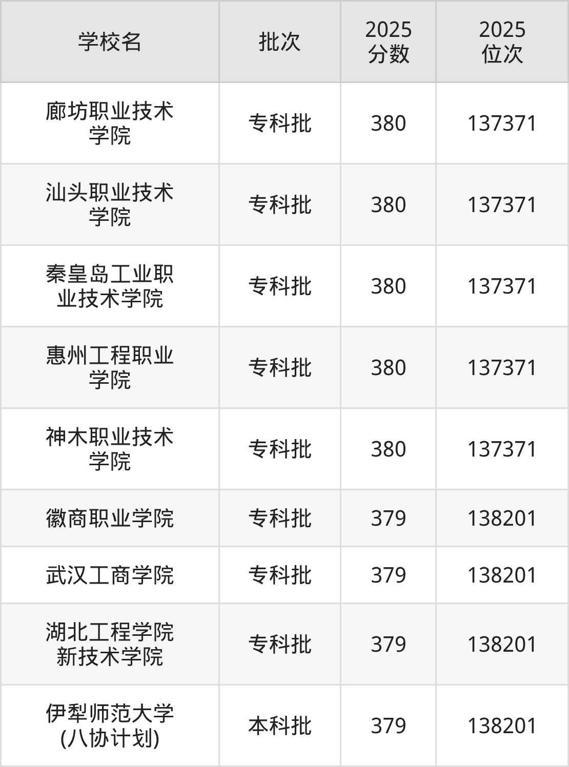 2025年河北高考历史类379分(137372名~138201名)能上的大学有徽商职业学院、伊犁师范大学(八协计划)、武汉工商学院、湖北工程学院新技术学院。