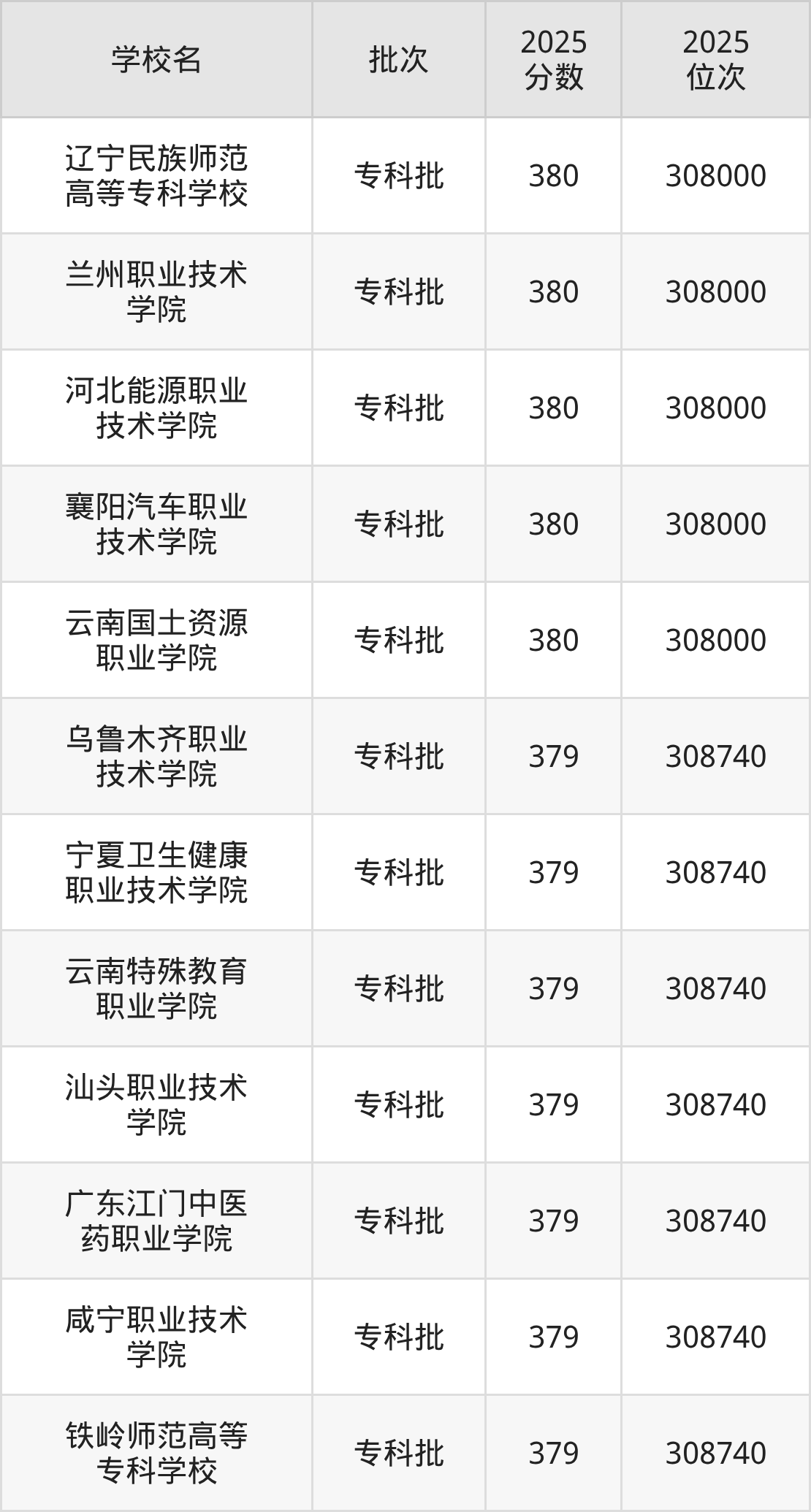 2025年河北高考物理类379分(308001名~308740名)能上的大学有宁夏卫生健康职业技术学院、汕头职业技术学院、云南特殊教育职业学院、广东江门中医药职业学院等。