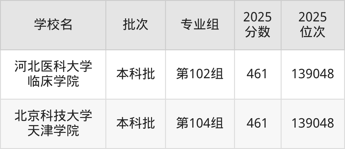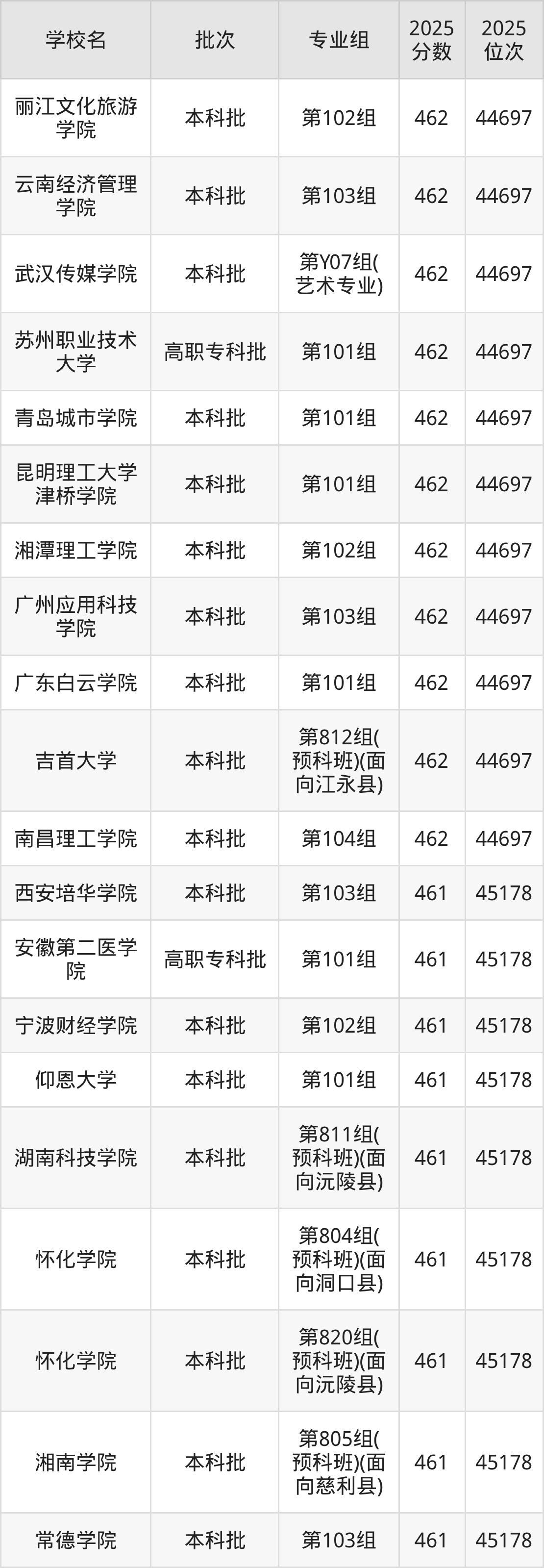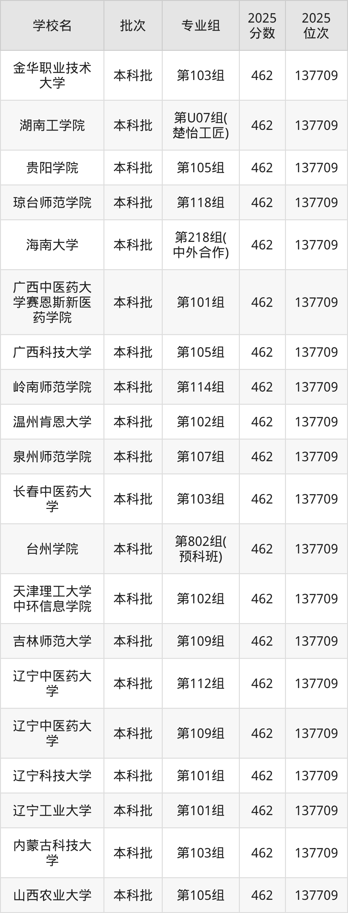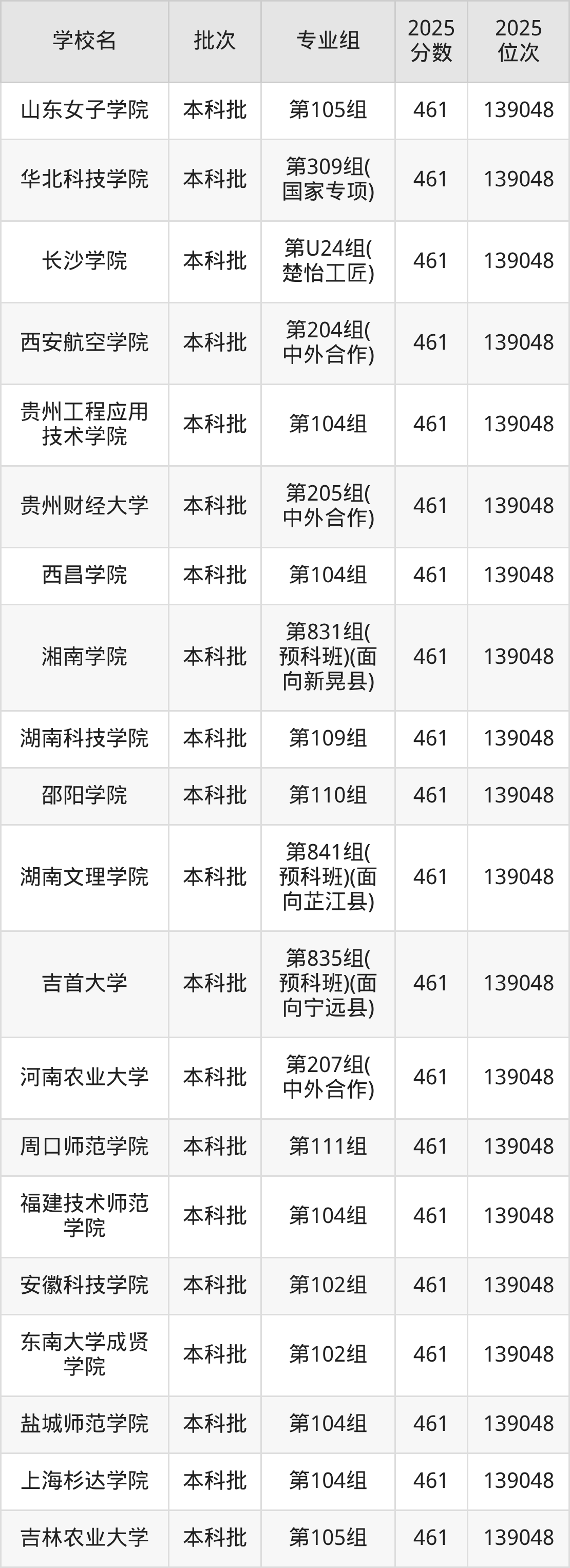 2025年湖南高考物理类461分(137710名~139048名)能上的大学有华北科技学院第309组(国家专项)、北京科技大学天津学院第104组、河北医科大学临床学院第102组、吉林农业大学第105组等。