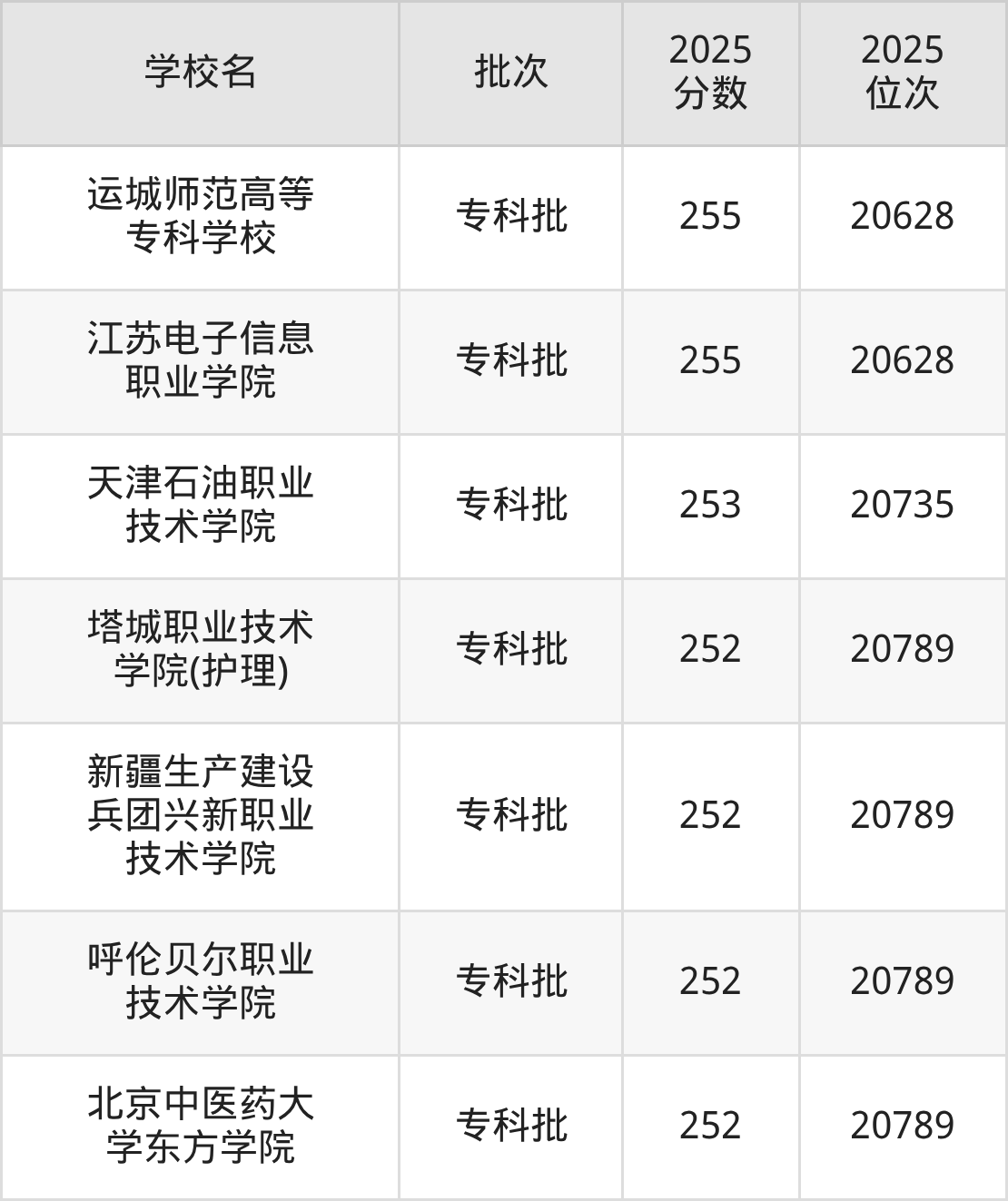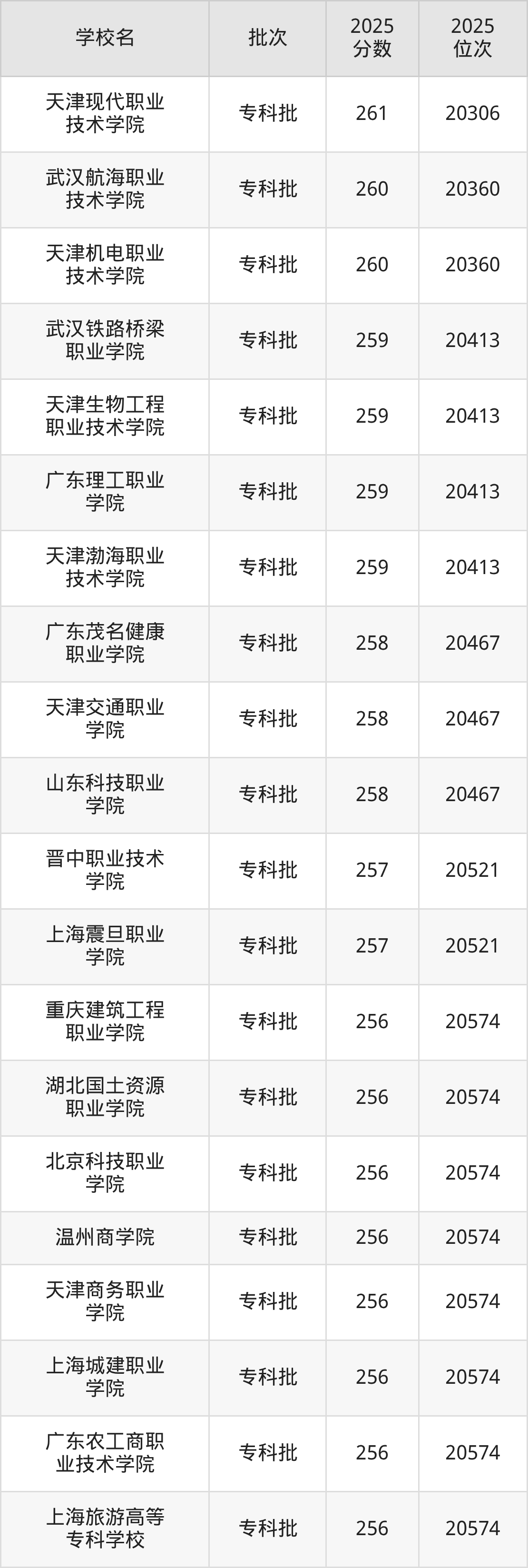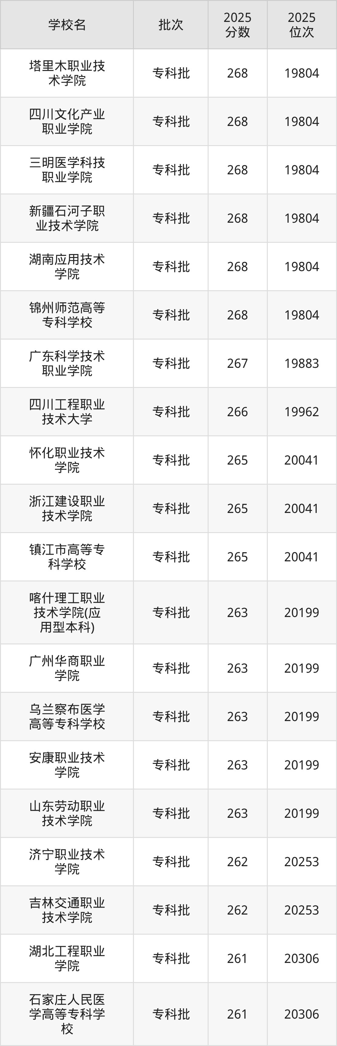 2025年新疆高考文科261分(20254名~20306名)能上的大学有天津现代职业技术学院、石家庄人民医学高等专科学校、湖北工程职业学院。