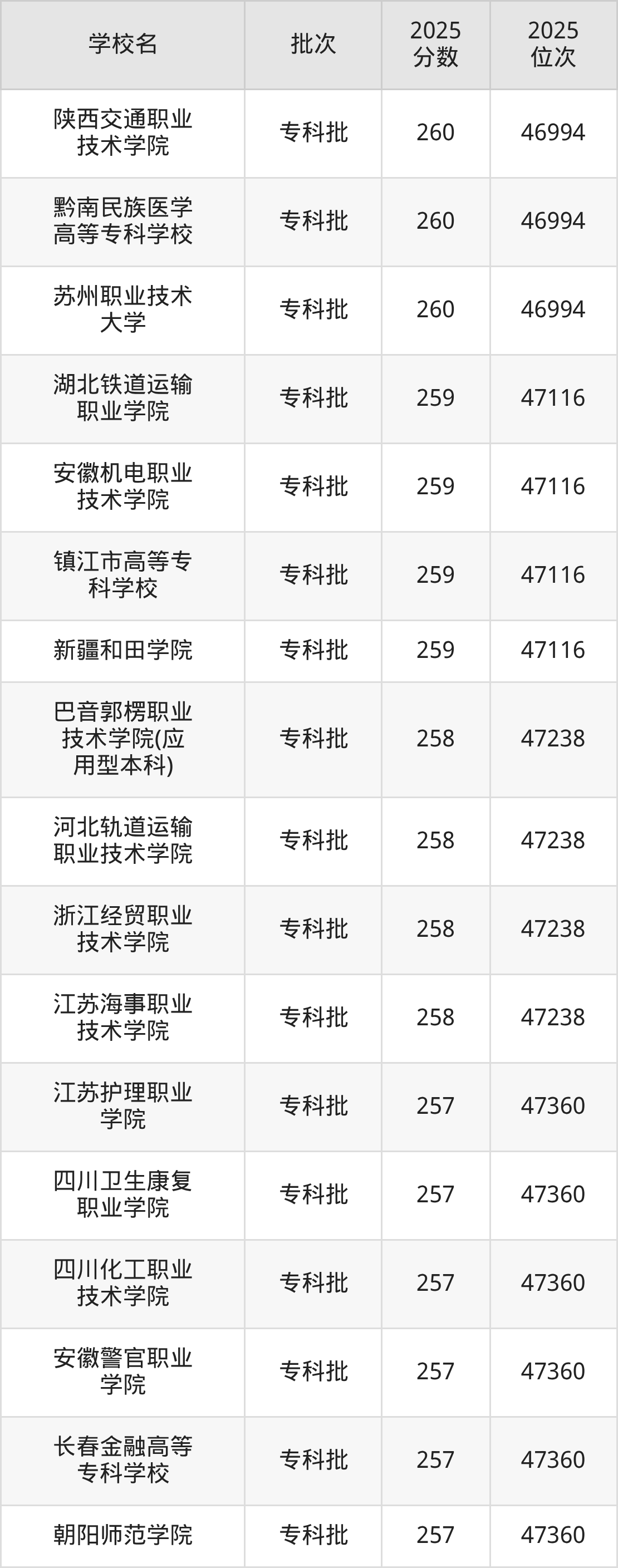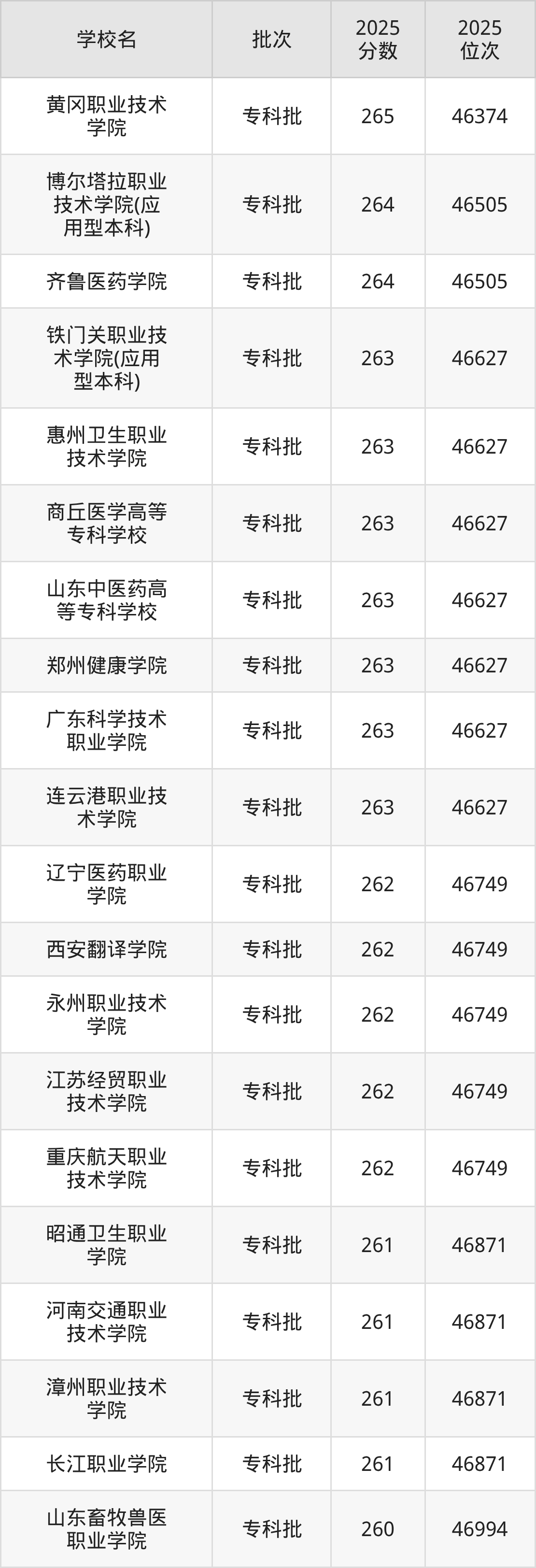 2025年新疆高考理科261分(46750名~46871名)能上的大学有长江职业学院、漳州职业技术学院、河南交通职业技术学院、昭通卫生职业学院。