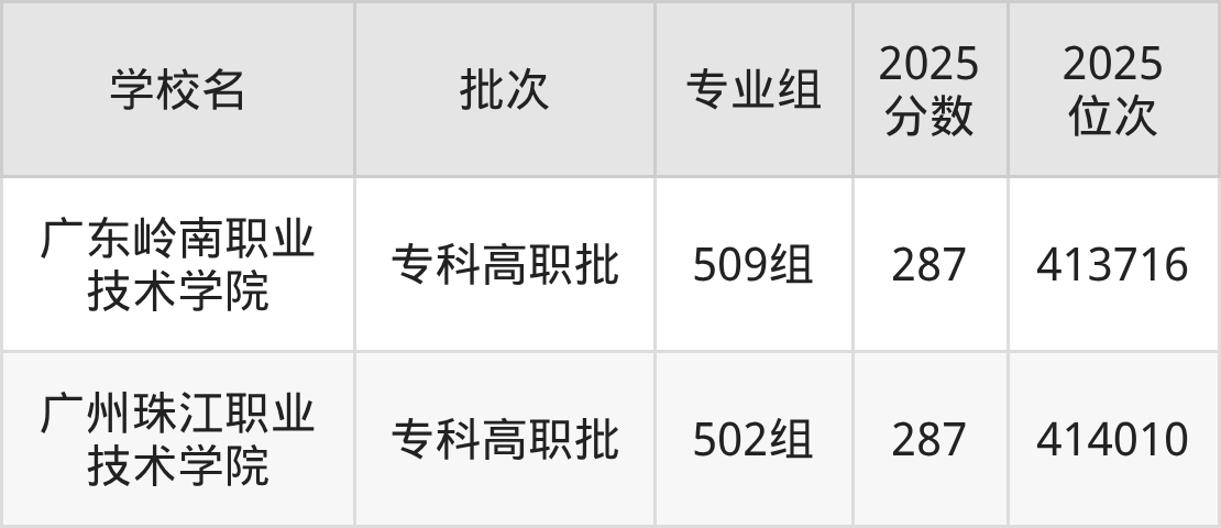 2025年广东高考物理类288分(413206名~413689名)录取位次低于该区间(较稳妥)的有广东岭南职业技术学院509组(413716名)、广州珠江职业技术学院502组(414010名)等;录取位次高于该区间(可冲)的有石家庄城市经济职业学院504组(412226名)、永州职业技术学院507组(412206名)等。