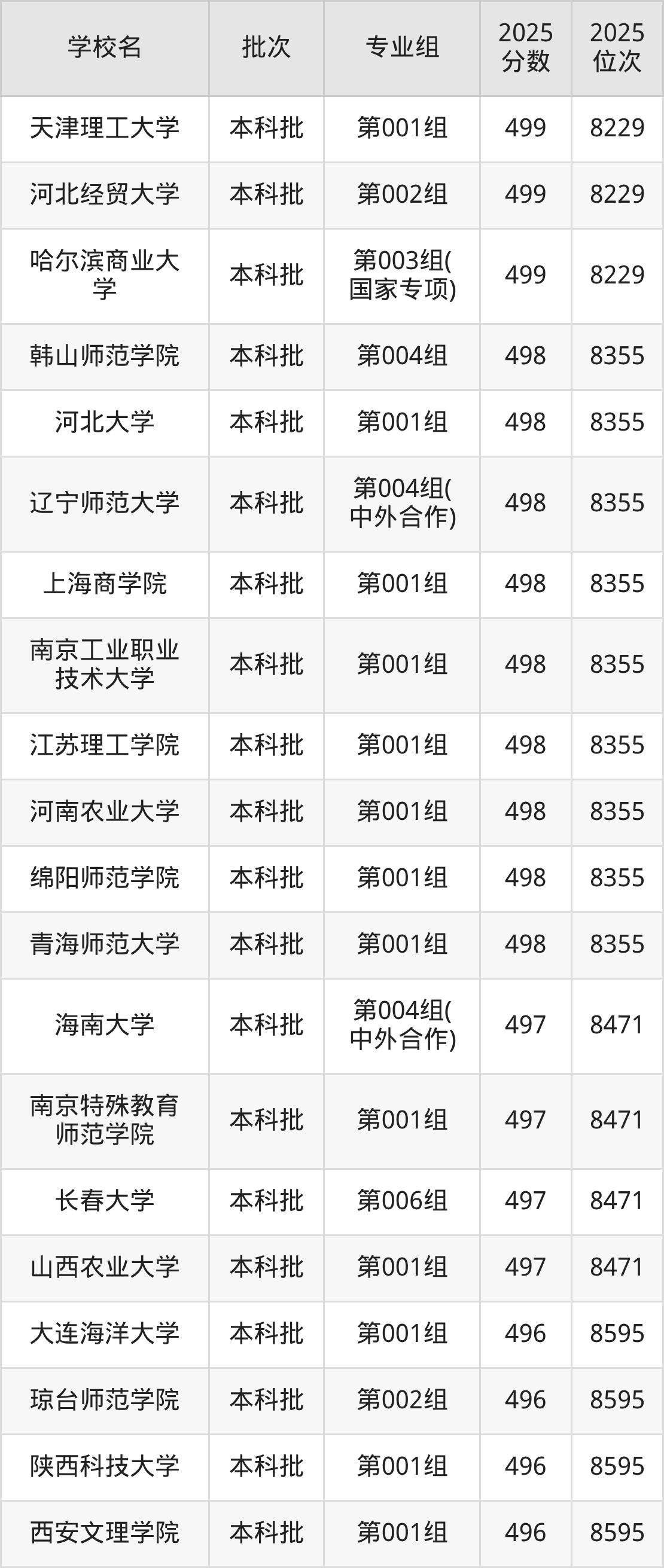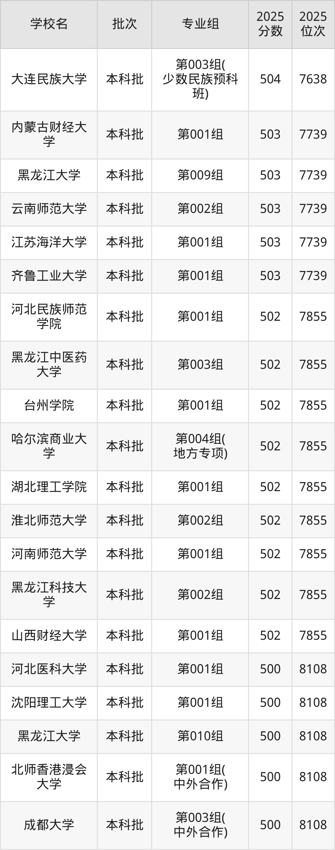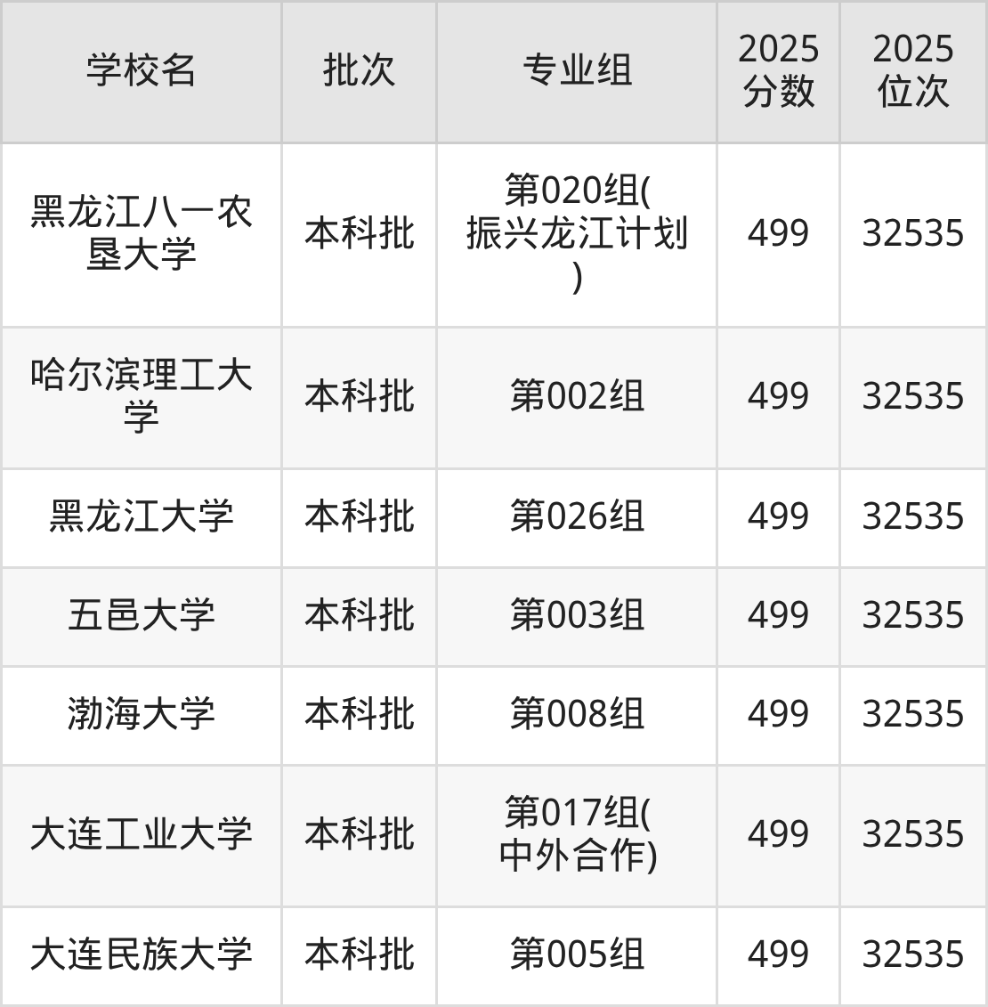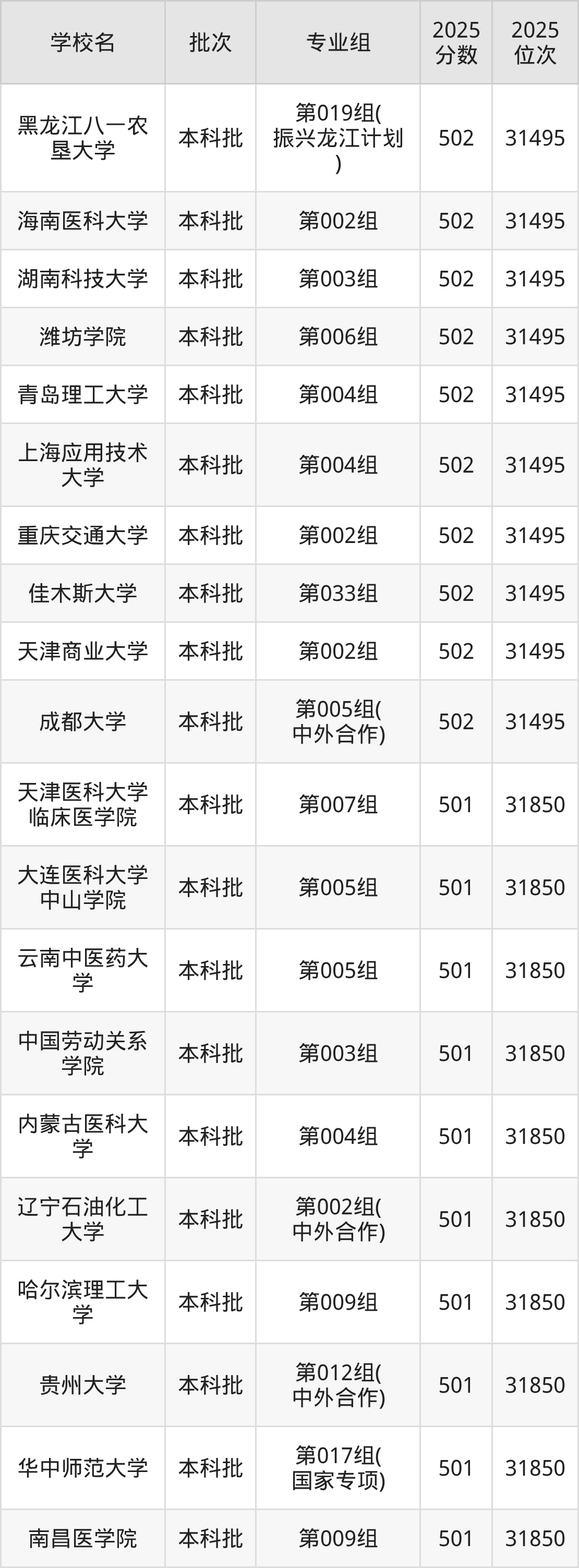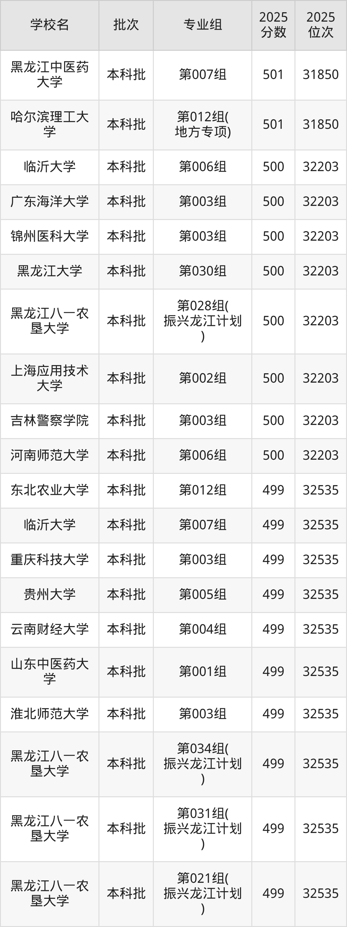 2025年黑龙江高考物理类500分(31851名~32203名)能上的大学有锦州医科大学第003组、吉林警察学院第003组、黑龙江大学第030组、黑龙江八一农垦大学第028组(振兴龙江计划)等。