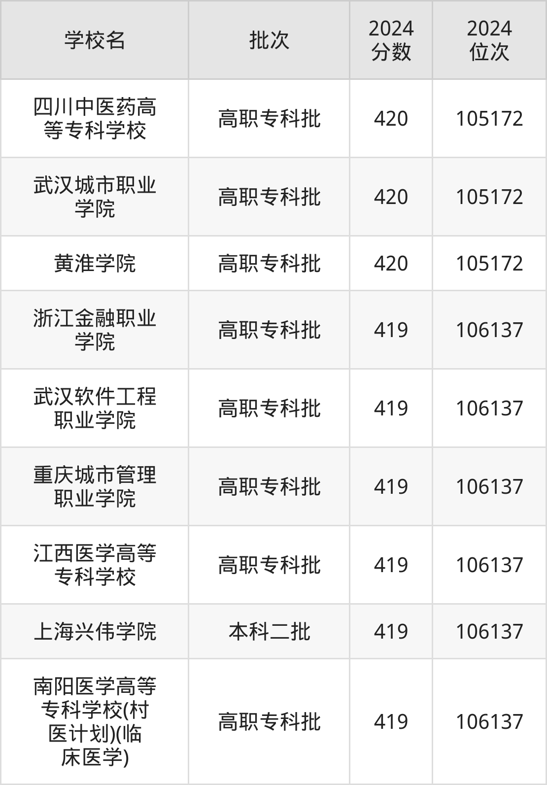 2024年河南高考文科419分(105173名~106137名)能上的大学有上海兴伟学院、江西医学高等专科学校、重庆城市管理职业学院、武汉软件工程职业学院等。