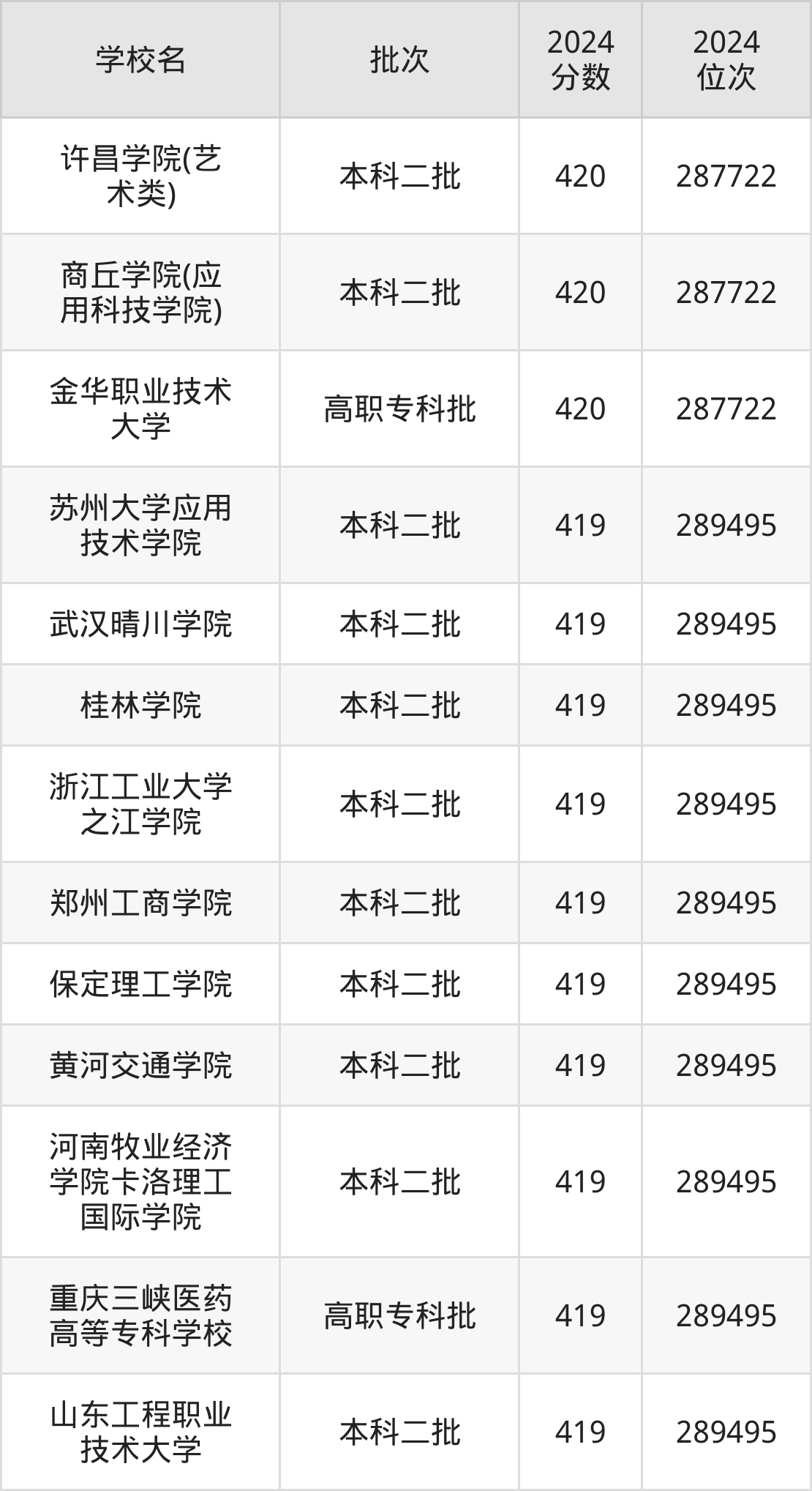 2024年河南高考理科419分(287724名~289496名)能上的大学有保定理工学院、浙江工业大学之江学院、苏州大学应用技术学院、武汉晴川学院等。