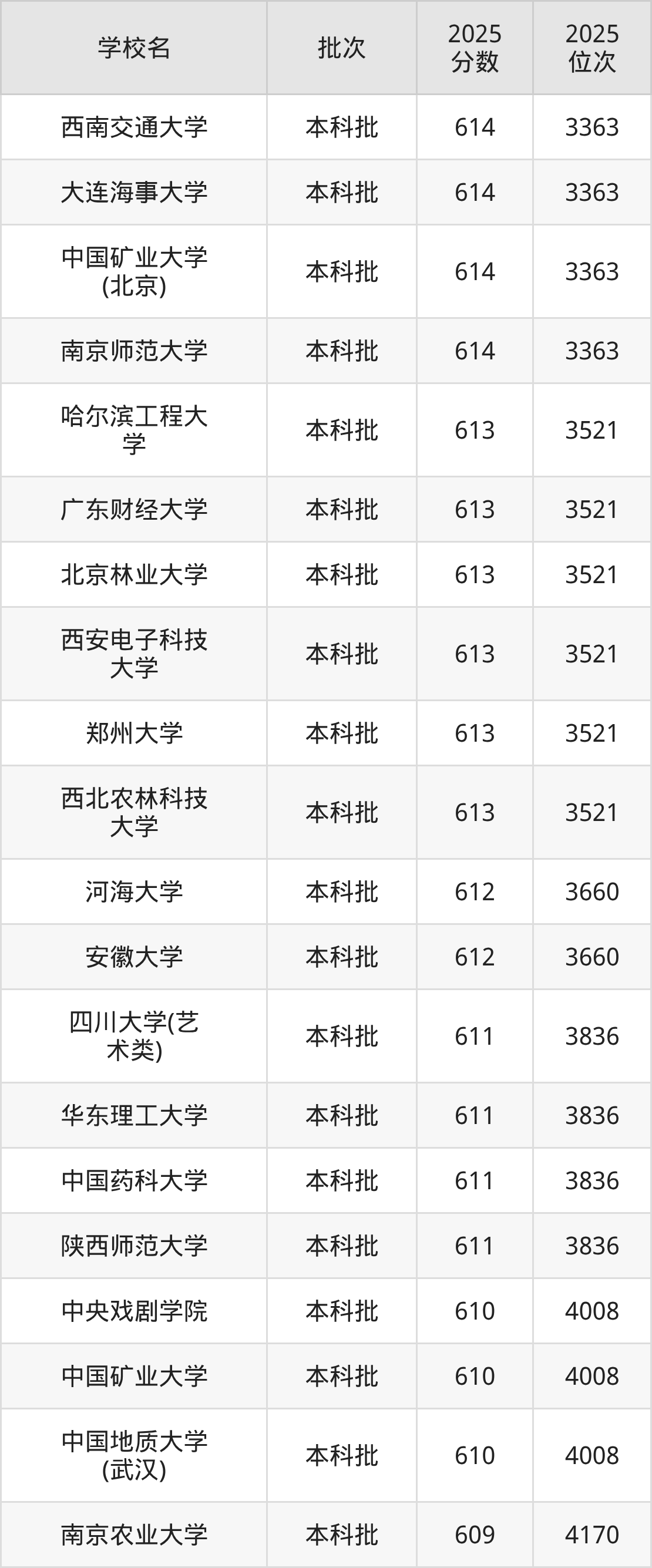 2025年河北高考历史类610分(3837名~4008名)能上的大学有中国地质大学(武汉)、中国矿业大学、中央戏剧学院。