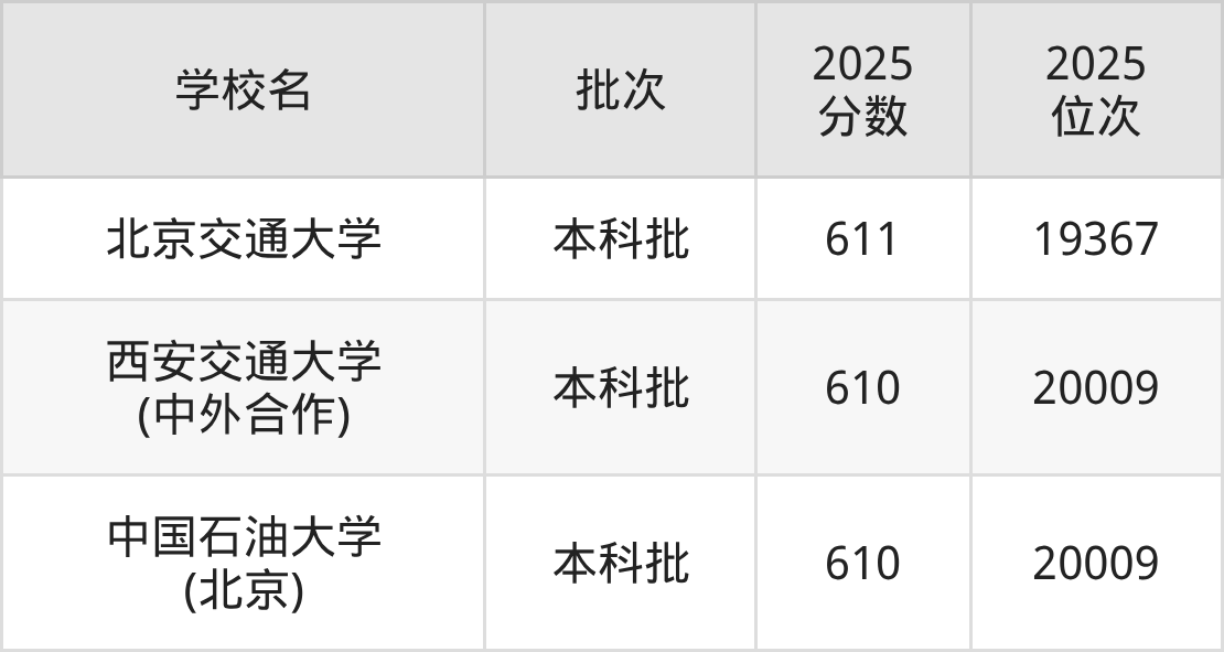 2025年河北高考物理类610分(19368名~20009名)能上的大学有西安交通大学(中外合作)、中国石油大学(北京)。