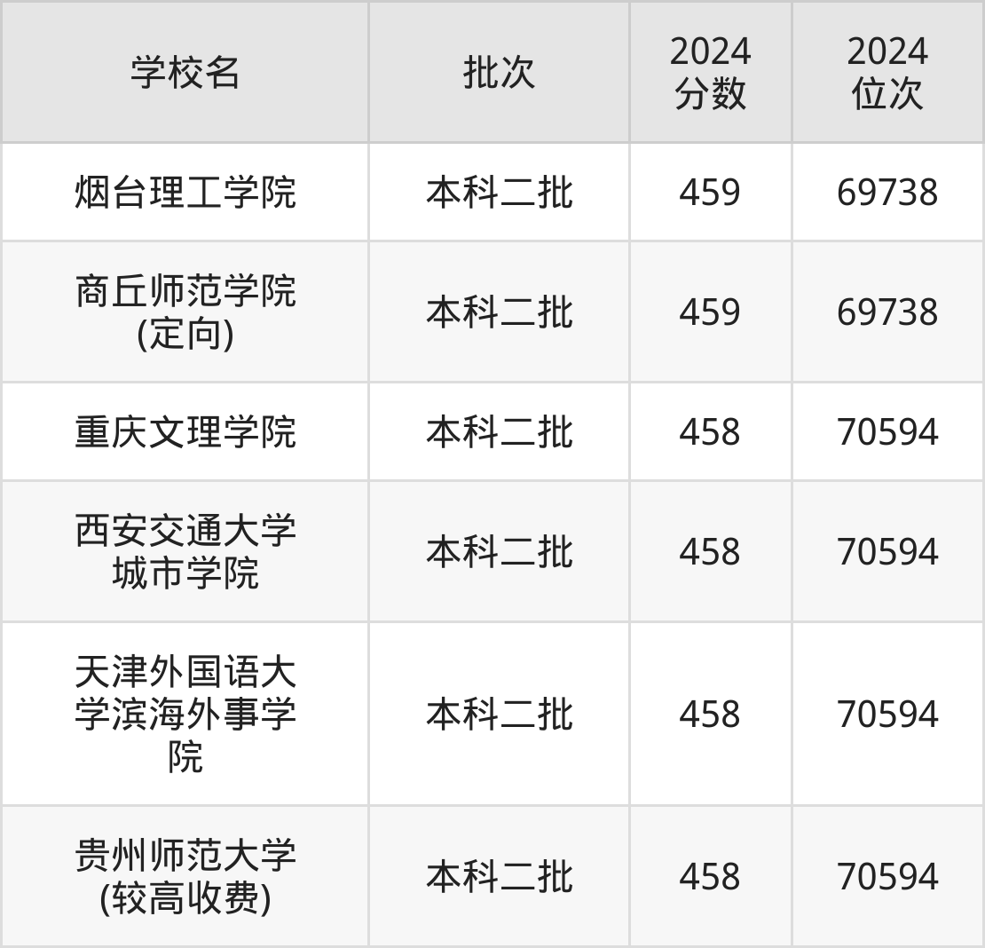 2024年河南高考文科458分(69739名~70594名)能上的大学有重庆文理学院、西安交通大学城市学院、天津外国语大学滨海外事学院、贵州师范大学(较高收费)。
