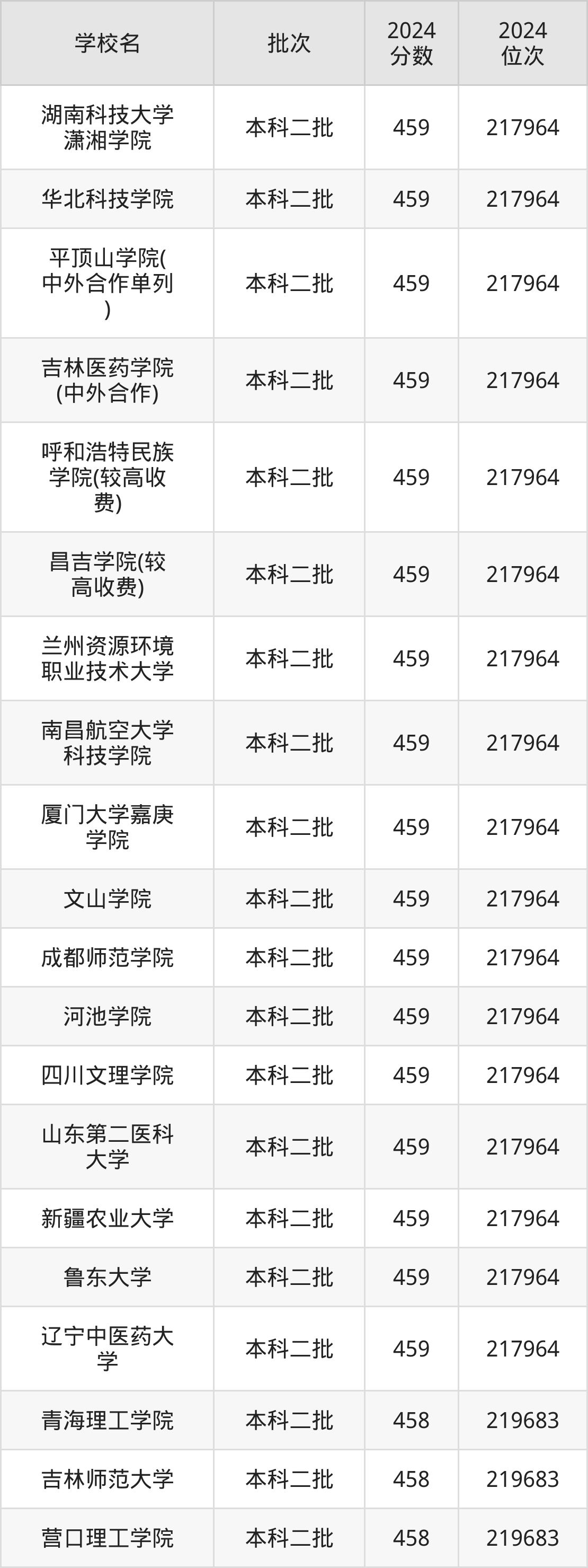 这些都是2025年高考理科217965名~219683名考生可以报考的大学,更多学校名单如下表所示: