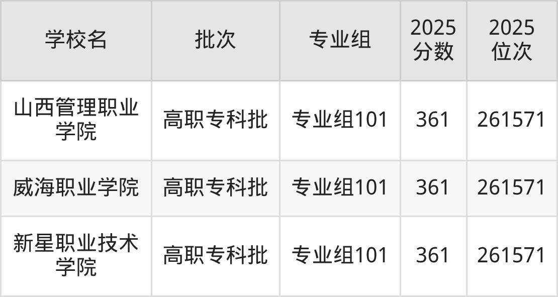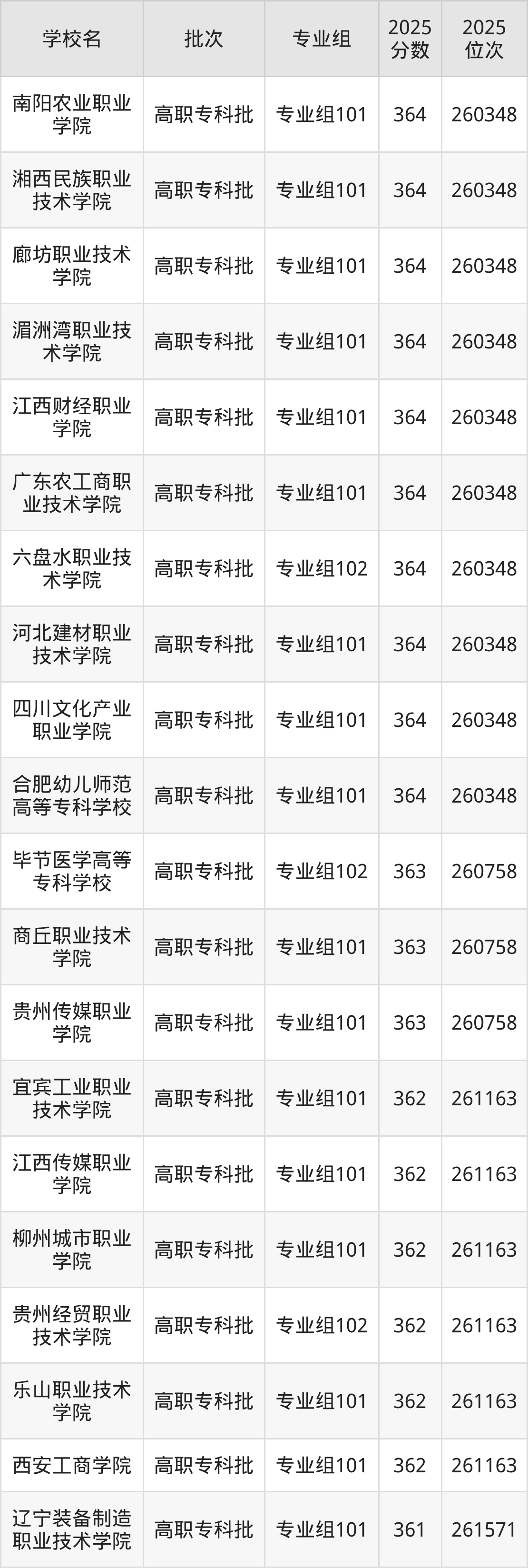 另外录取位次低于该区间(较稳妥)的有山西管理职业学院专业组101(261571名)、辽宁装备制造职业技术学院专业组101(261571名)等;录取位次高于该区间(可冲)的有贵州传媒职业学院专业组101(260758名)、商丘职业技术学院专业组101(260758名)等。