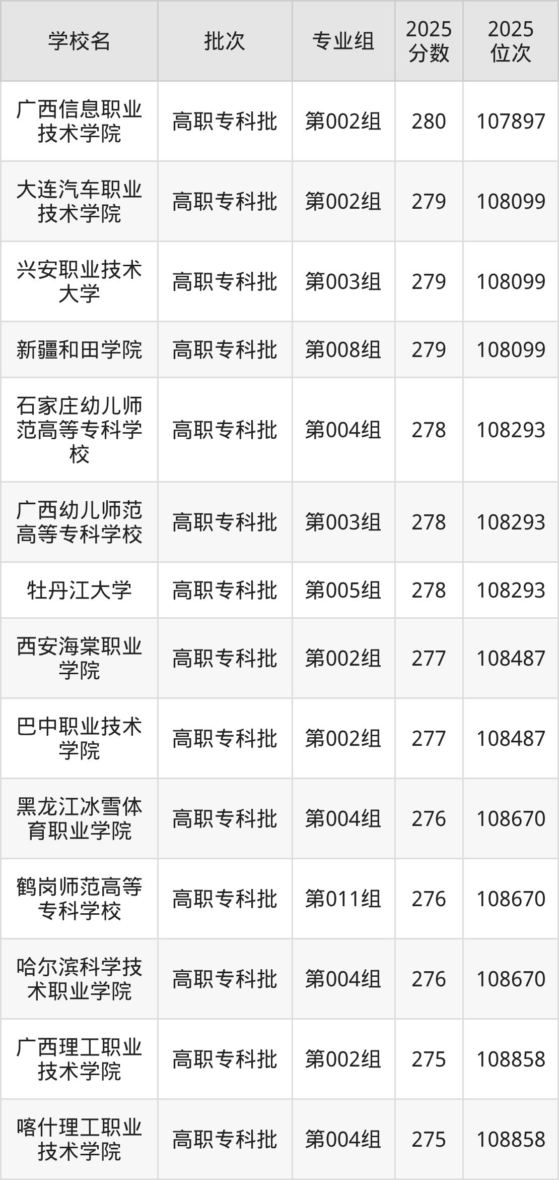 2025年黑龙江高考物理类277分(108294名~108487名)能上的大学有巴中职业技术学院第002组、西安海棠职业学院第002组。