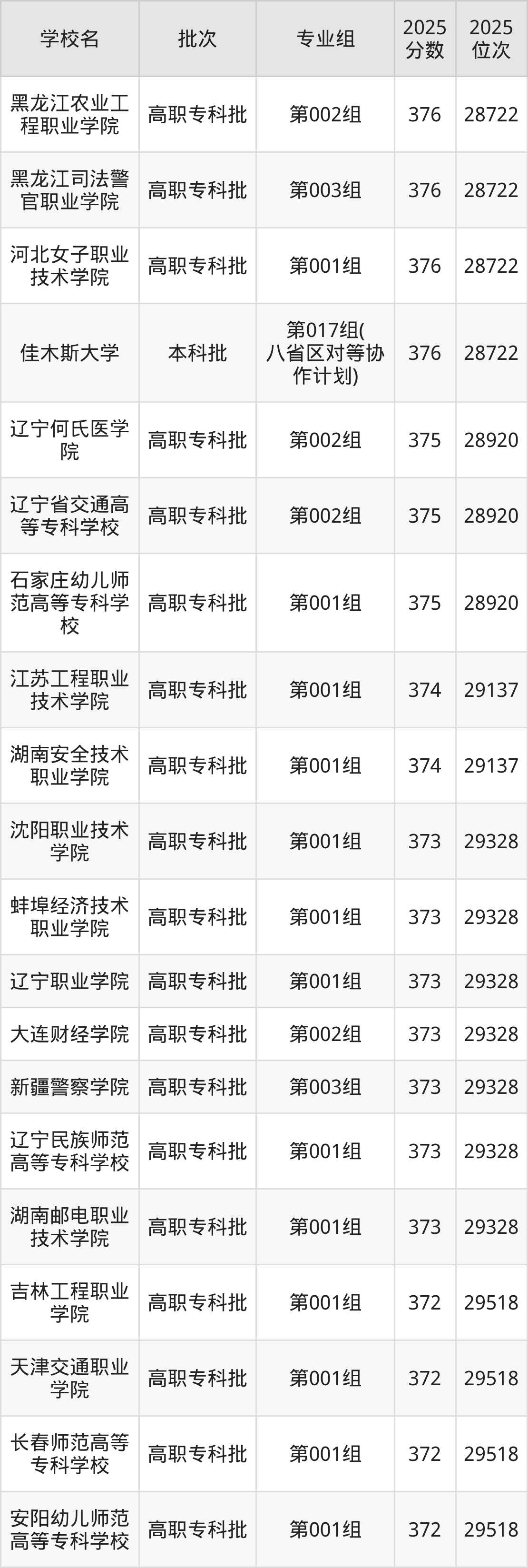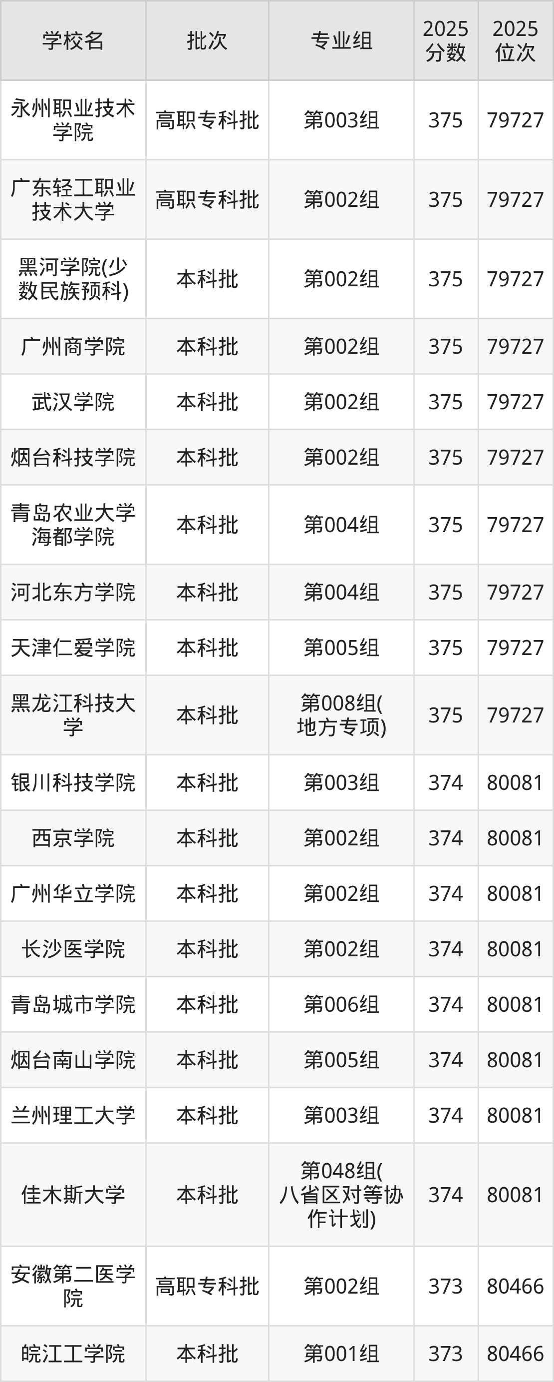 2025年黑龙江高考物理类373分(80082名~80466名)能上的大学有新疆第二医学院第003组、运城职业技术大学第002组、辽宁师范大学海华学院第004组、皖江工学院第001组等。