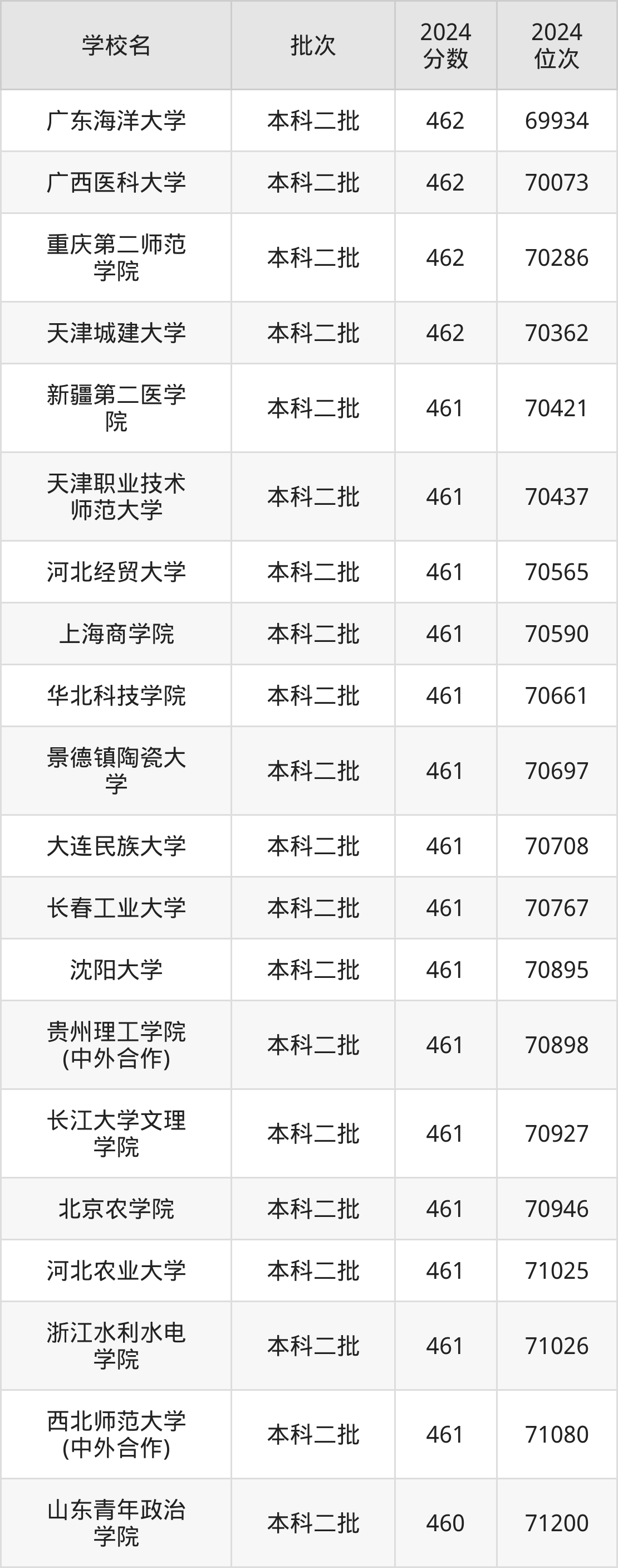 2024年陕西高考理科461分(70402名~71109名)能上的大学有北京农学院、天津职业技术师范大学、河北农业大学、华北科技学院等。