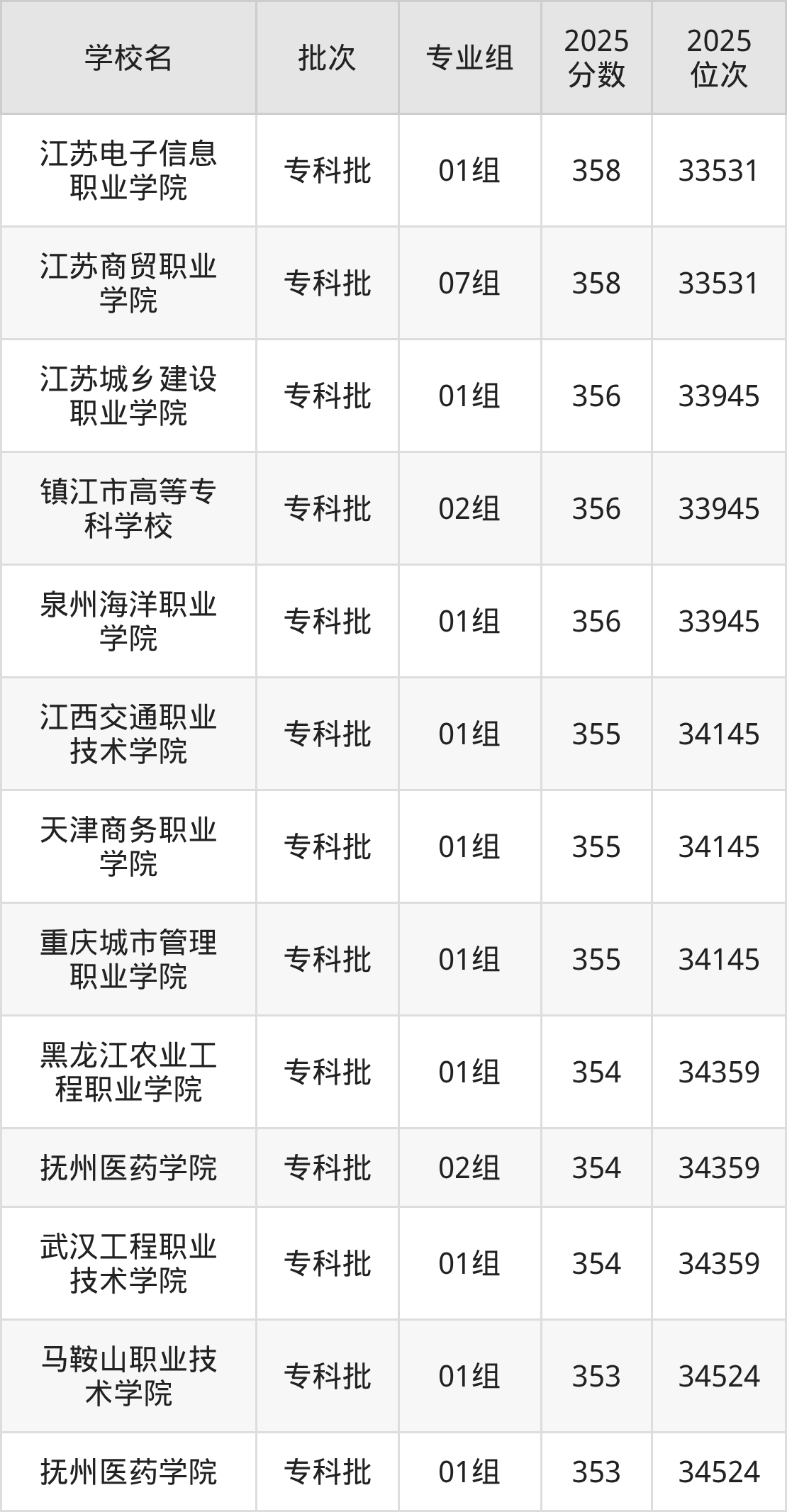 2025年江苏高考历史类355分(33946名~34145名)能上的大学有江西交通职业技术学院01组、天津商务职业学院01组、重庆城市管理职业学院01组。