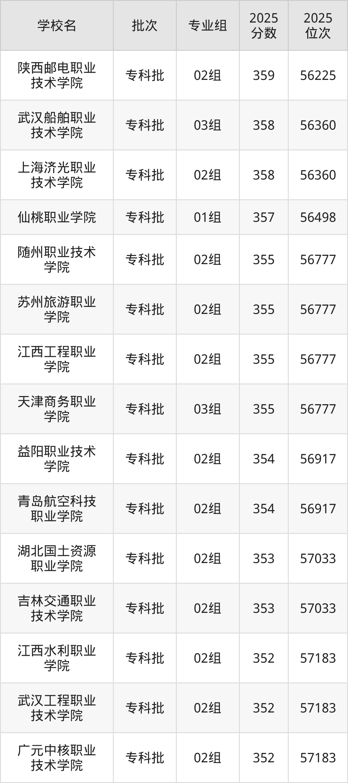 2025年江苏高考物理类355分(56627名~56777名)能上的大学有苏州旅游职业学院02组、江西工程职业学院02组、天津商务职业学院03组、随州职业技术学院02组。